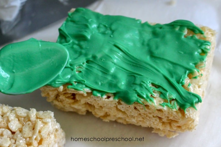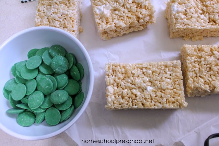 Melt the candy melts according to the directions on the bag. Once they’re completely melted, use a spoon to cover the tops of the rectangles. Allow candy melts to dry completely before the next step.