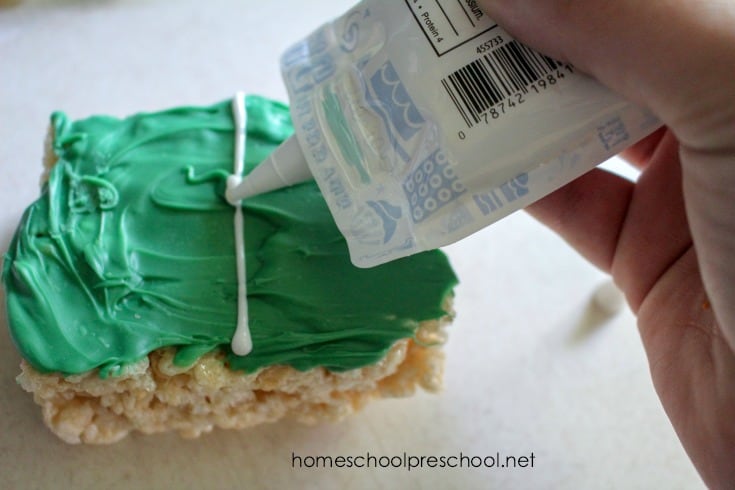 Once the candy coating has dried, use the white icing or decorating gel to make lines across the treats to resemble the football field.