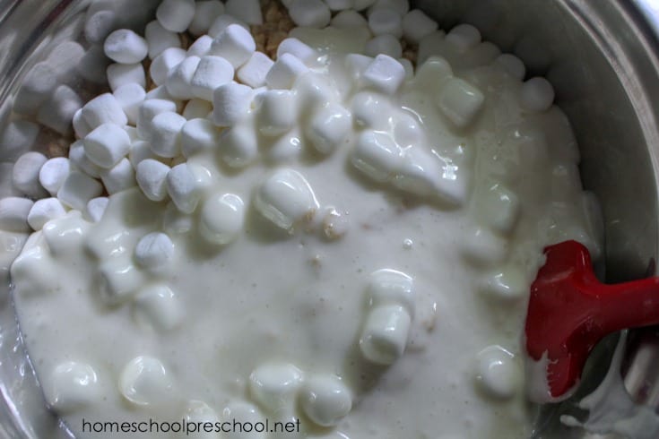 Next, pour 7 cups of Rice Krispies in a large mixing bowl. Pour the marshmallow mixture over the cereal, and stir thoroughly.