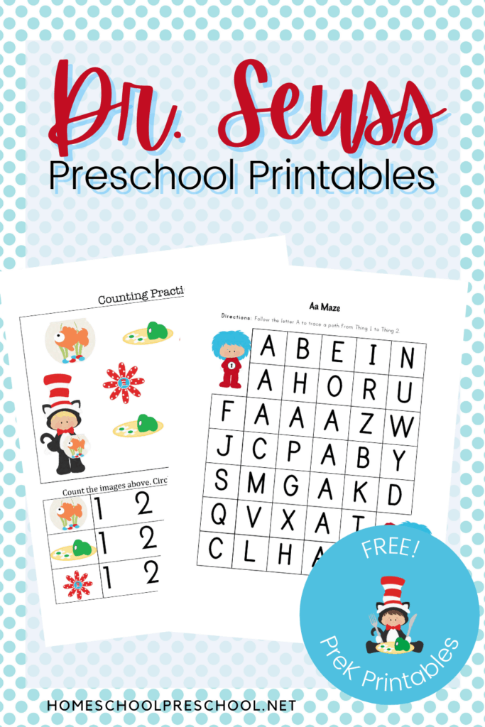 This free preschool printable includes 17 pages of Dr. Seuss-themed learning fun!