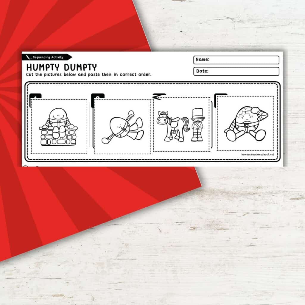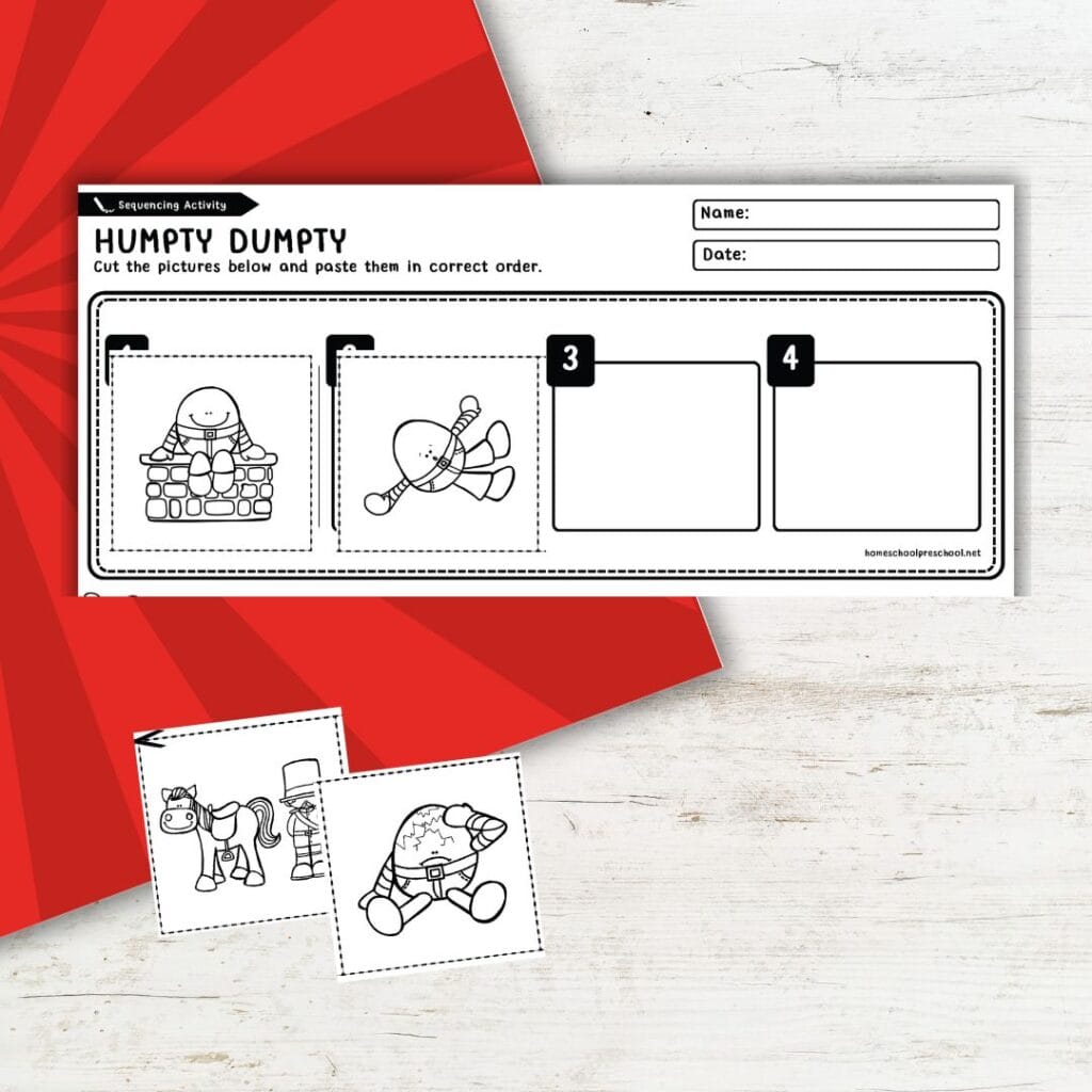 Start by reading or singing the Humpty Dumpty rhyme together to help them remember the story. Then, let them cut out the pictures and talk through what happens first, next, and last. As they paste the pictures in order, encourage them to describe the story in their own words—it’s a fun way to build storytelling skills!