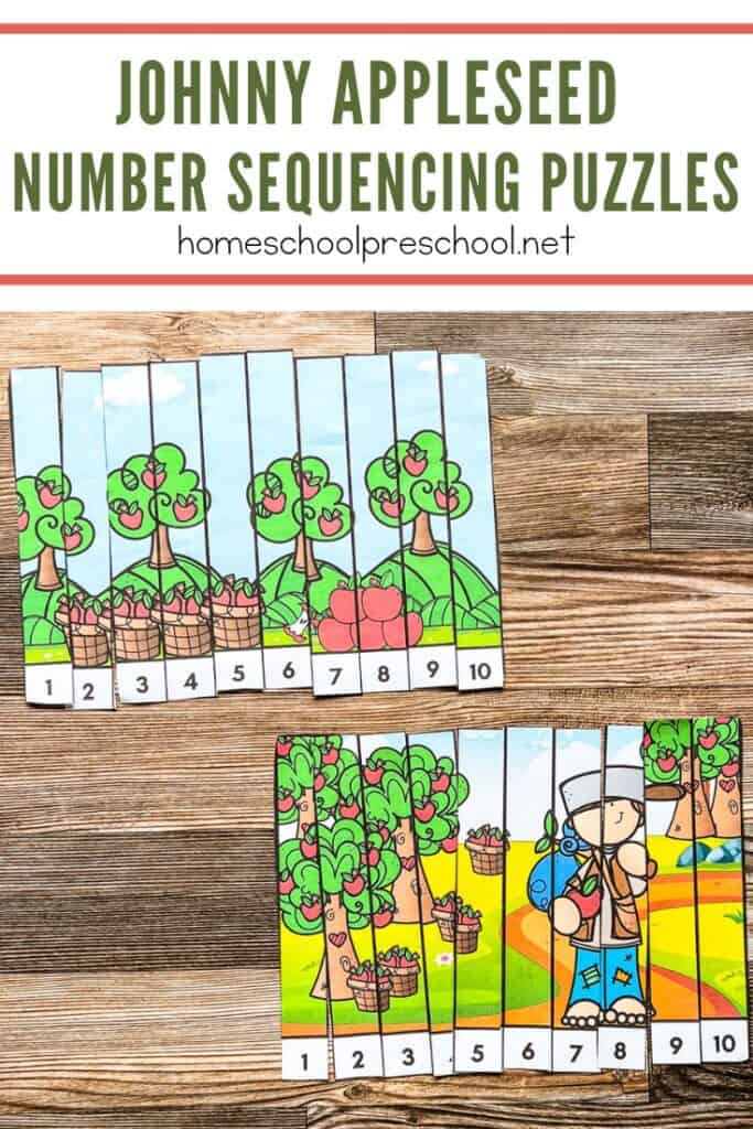 We’ve created a set of number sequence puzzles that you can easily download and print. These puzzles are designed for preschoolers, with clear, large numbers and fun illustrations of Johnny Appleseed’s adventures.