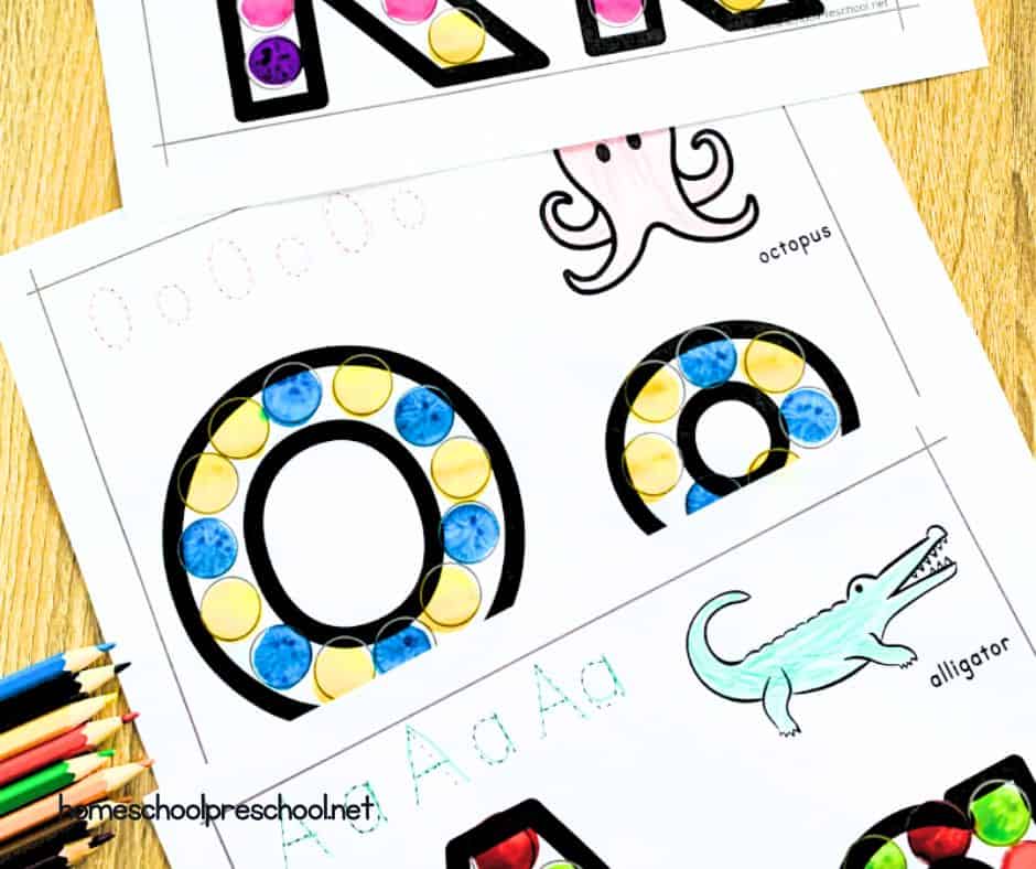 Toddlers between the ages of 1 and 3 are just beginning to explore letters, so worksheets should focus on exposure and play rather than memorization or writing. These alphabet printables help little ones recognize letter shapes while having fun with dot markers, playdough, and coloring tools.
