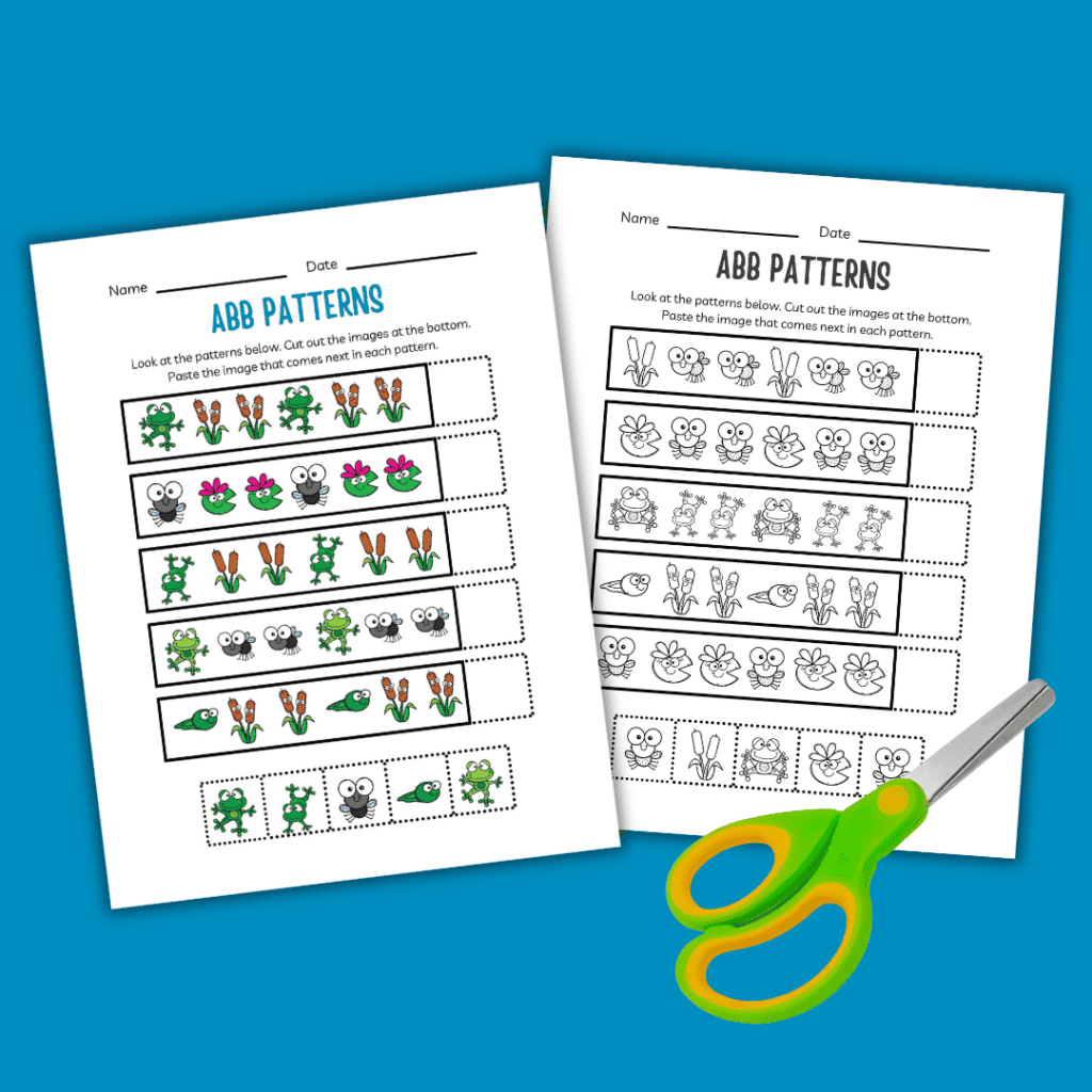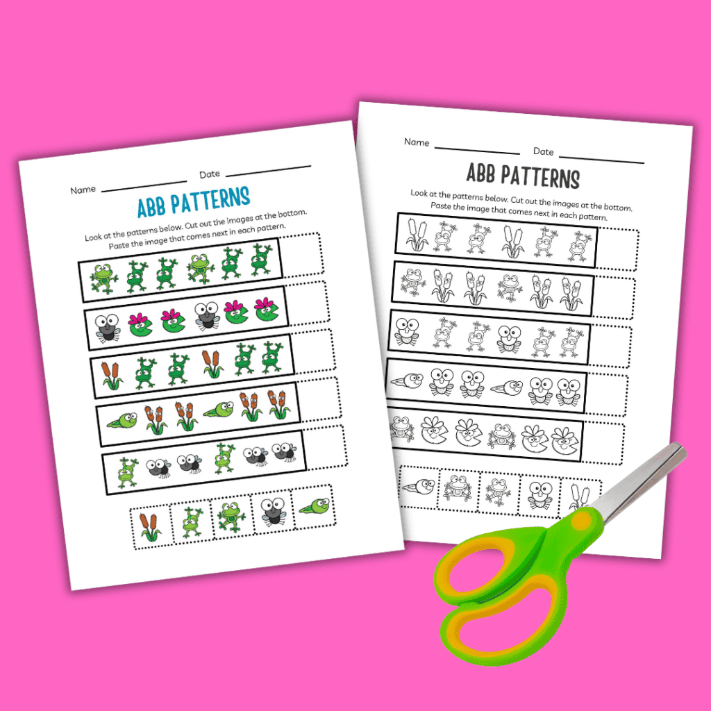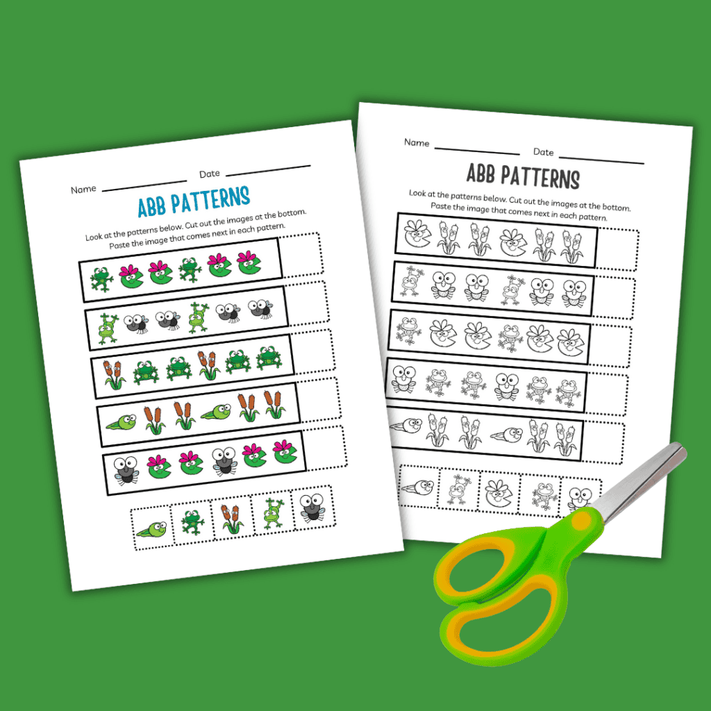 The pages in this activity pack ask children to identify the ABB pattern in each row. Then, they will cut and paste the image that comes next in each pattern.