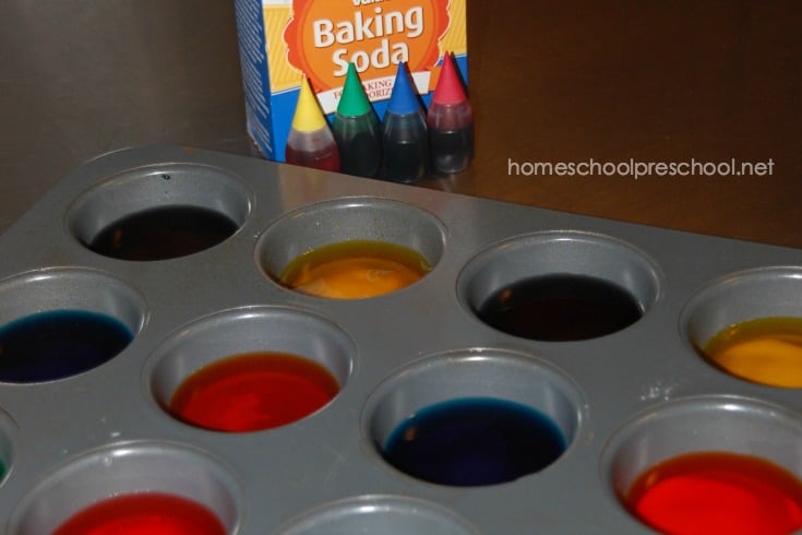Mix it up. That’s all you need to do. Mix the baking soda and water. We poured the mixture into a muffin tin, because that’s what we had on hand. You could use an ice cube tray or a silicone candy mold for shaped cubes.