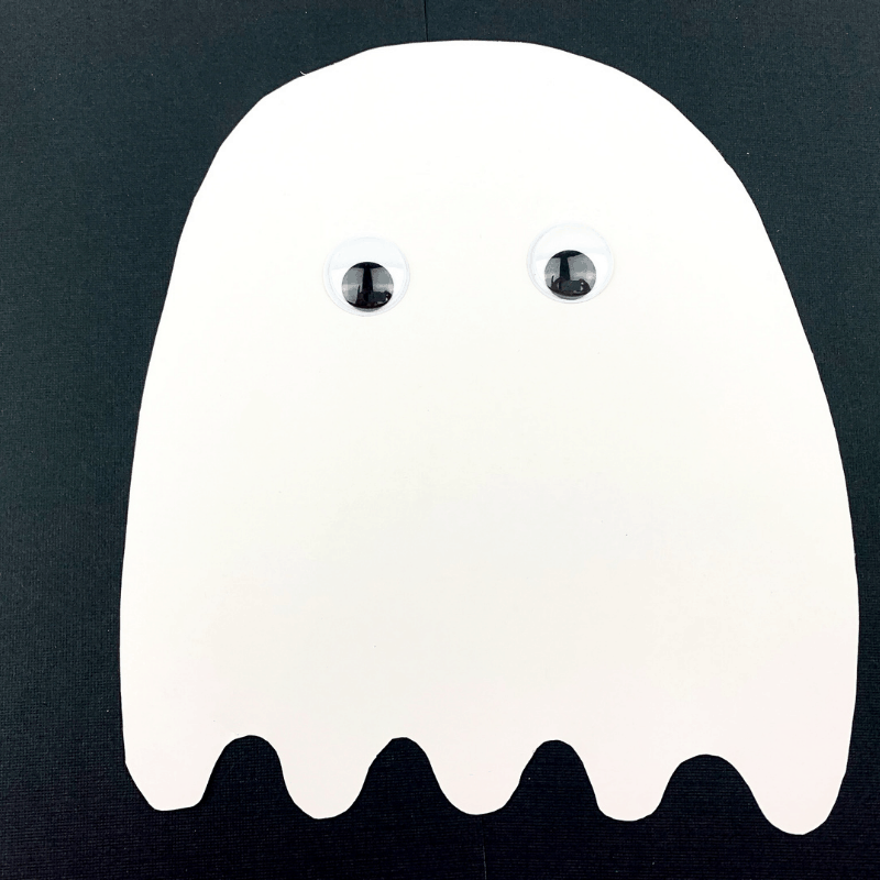 Glue the googly eyes onto the ghost face. Add the ‘eyebrows.’