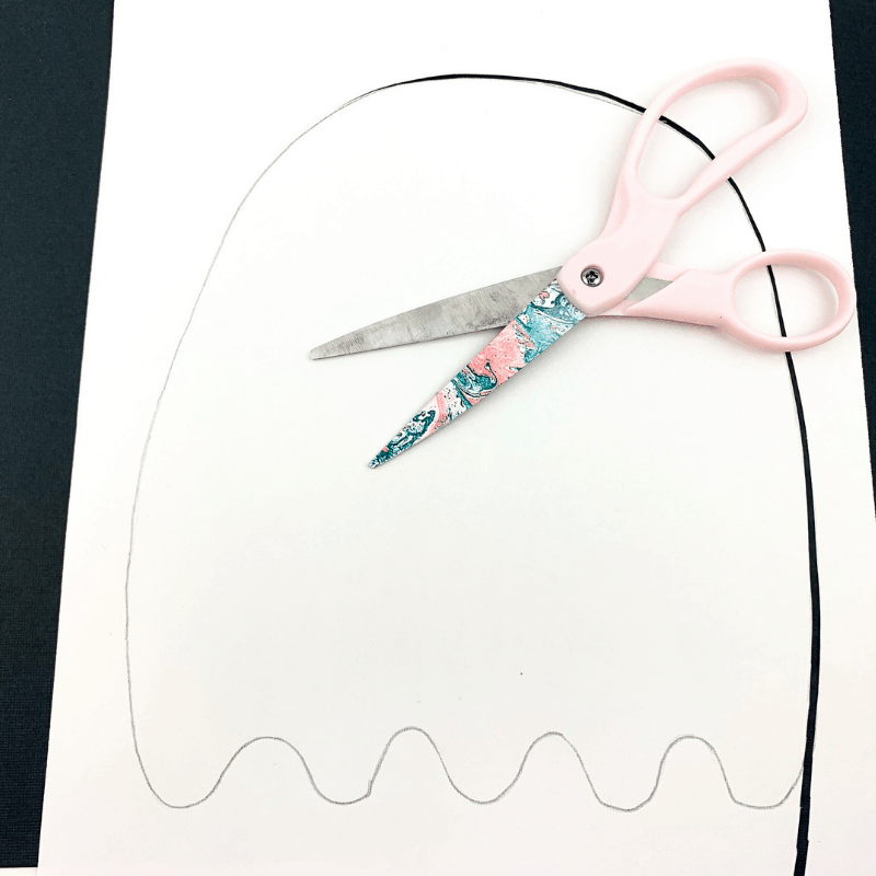 - Next, cut out the ghost. If your shape is super simple, this is a great opportunity for preschoolers to strengthen their scissor skills as they cut on the line you drew.