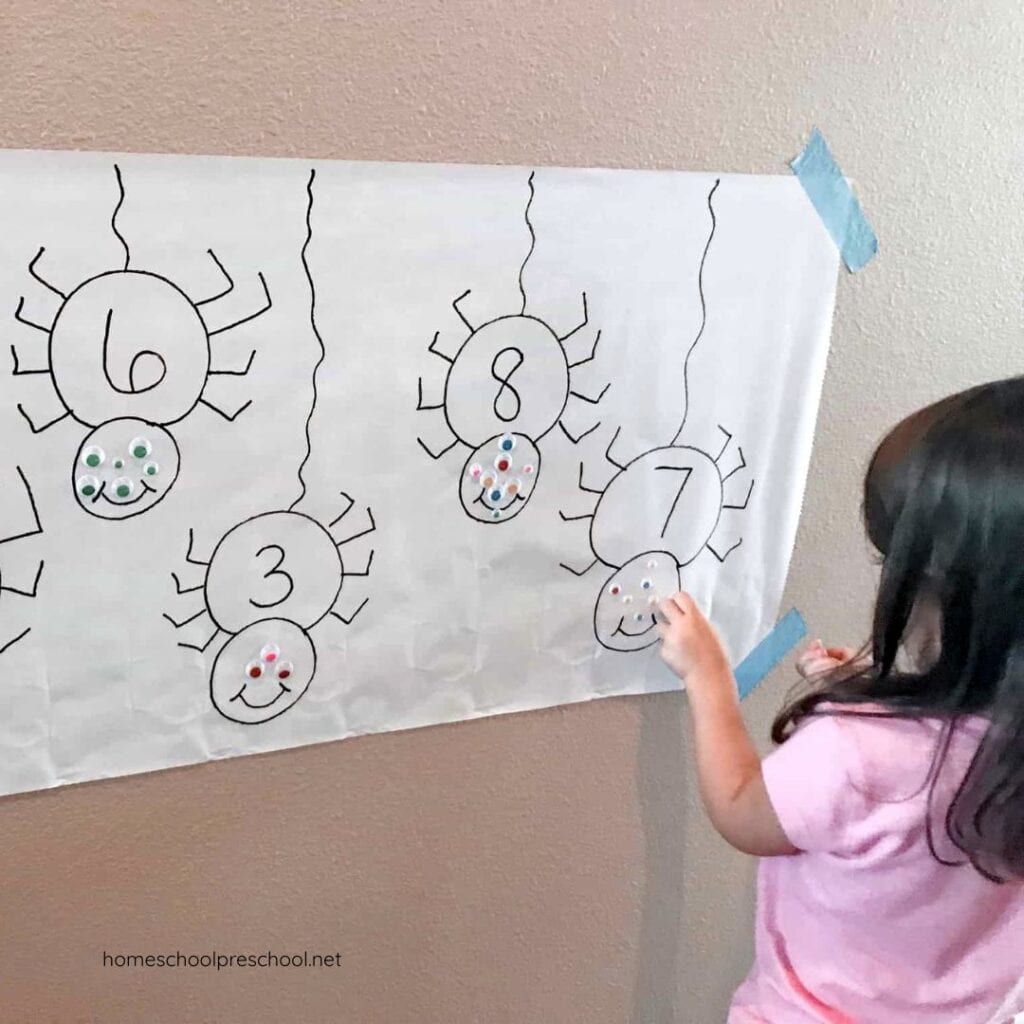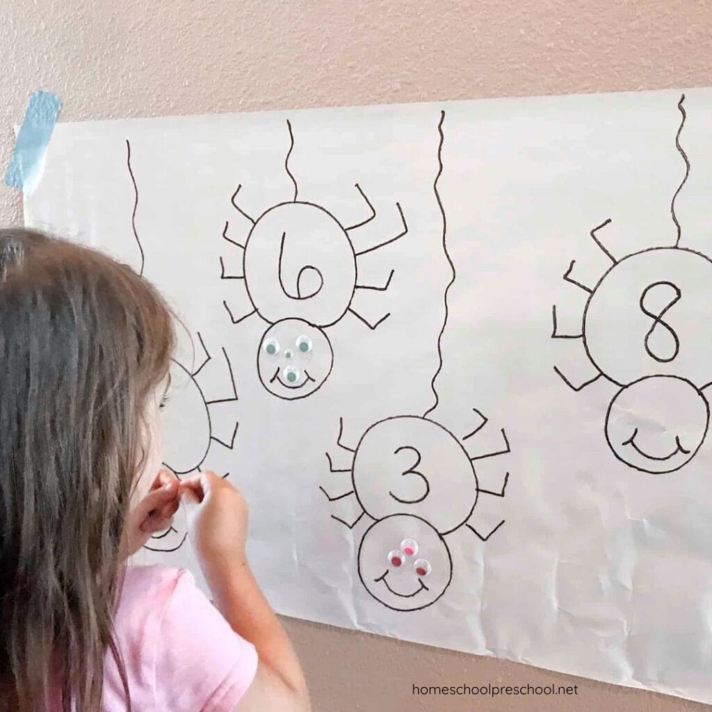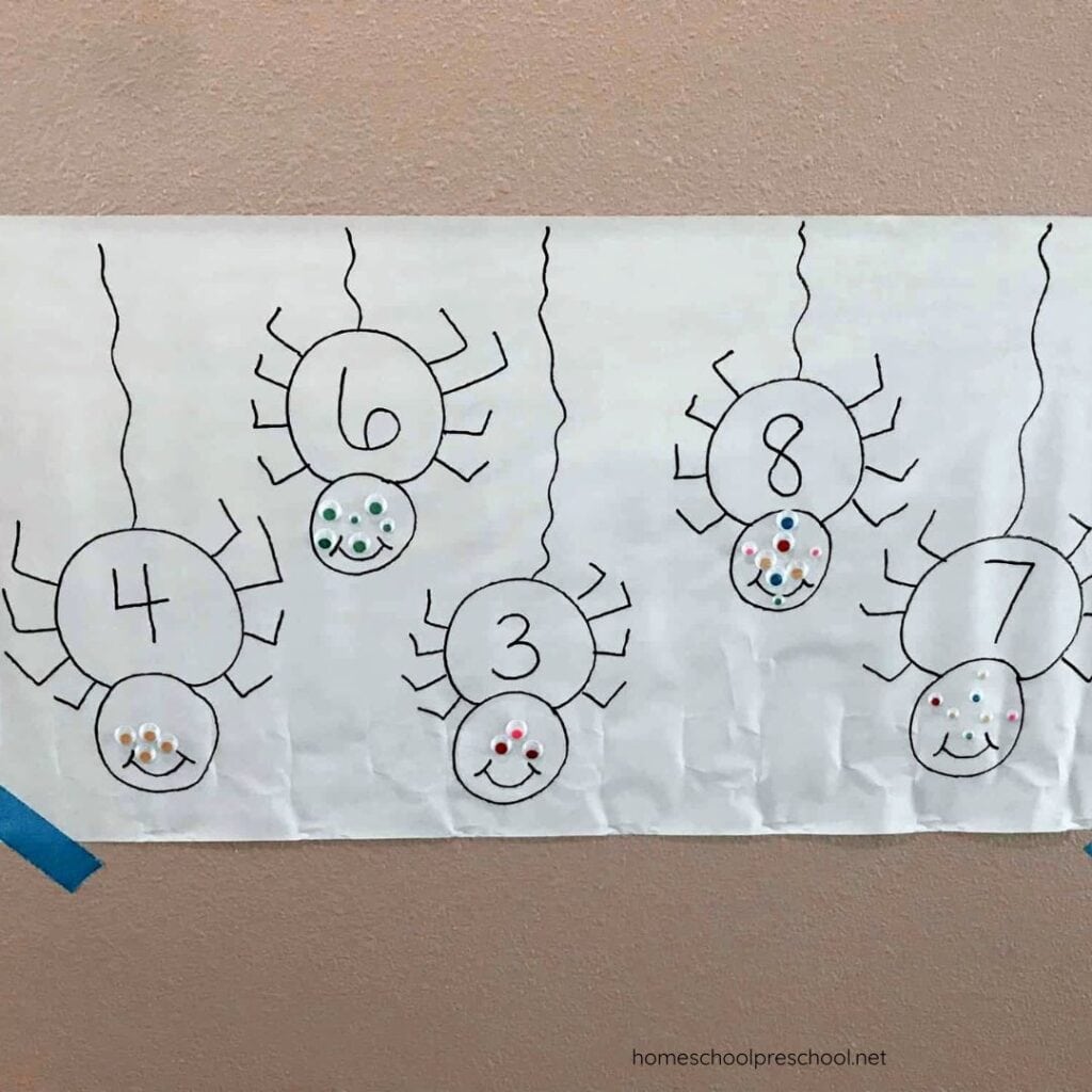 Set out a bowl of self-adhesive googly eyes nearby. That’s all the prep you need. The stage is set for kids to start counting and assign each spider the just-right number of eyes.