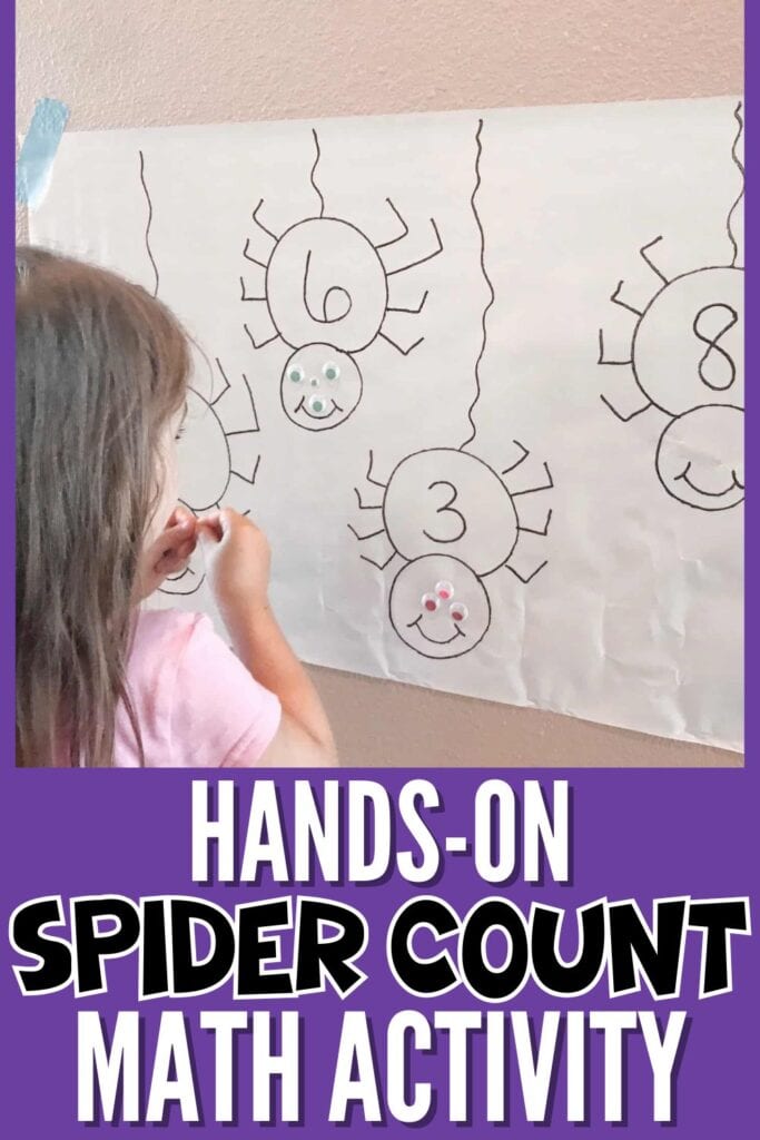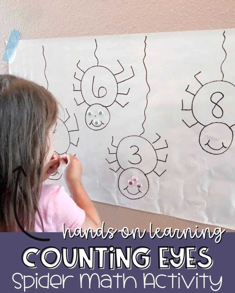 If you’re looking for a Halloween math activity for preschoolers that blends fun with hands-on preschool math, this simple spider game is a winner. All it takes is a large sheet of paper, some markers, and a pack of sticky googly eyes to turn counting practice into giggles.