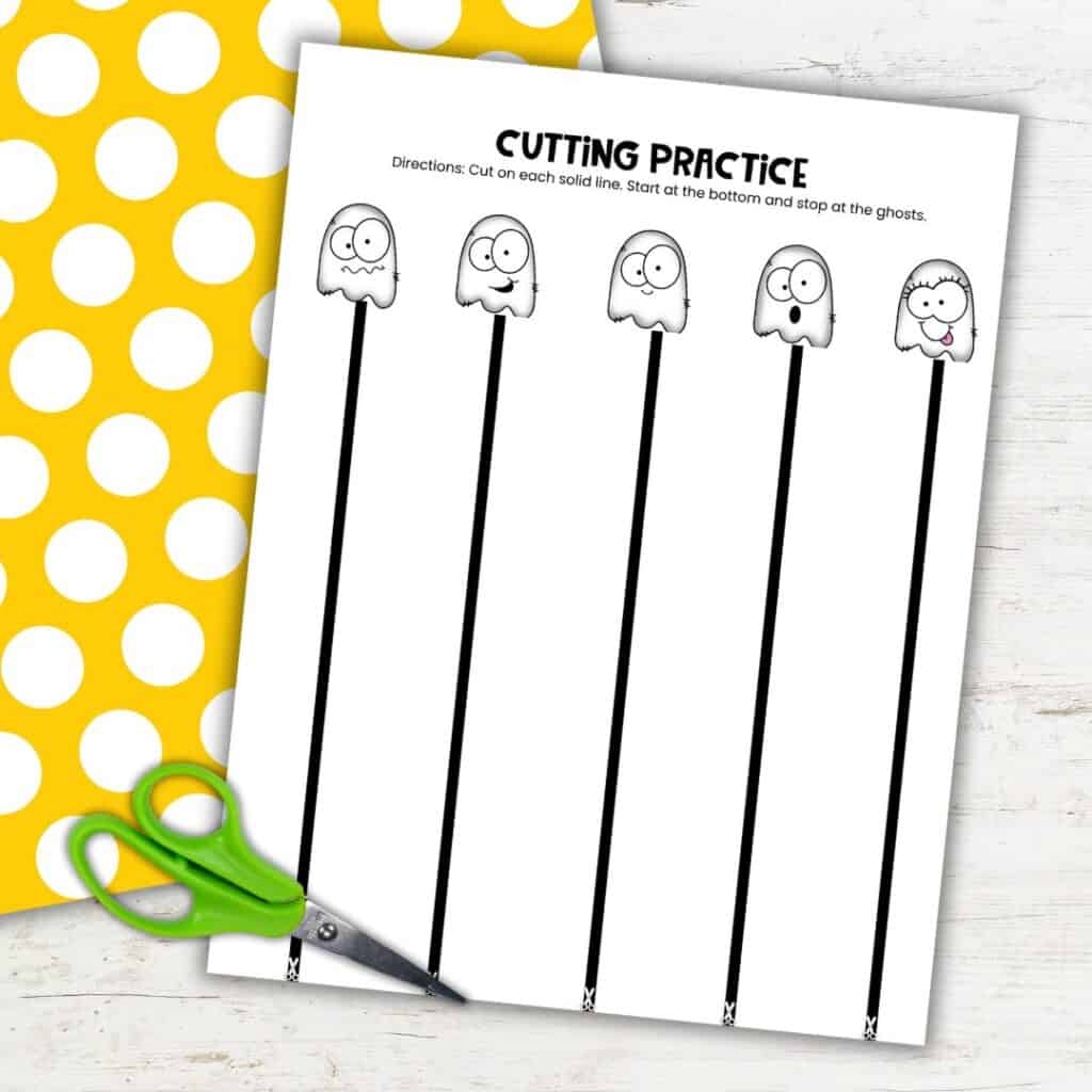- Page 3: Vertical lines that ask preschoolers to cut up toward the ghosts and stop right before reaching the top, building precision and focus.