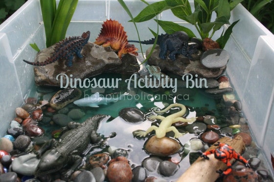 Sensory bins are great any time of year, and they can be made to fit almost any theme you’re working on in your homeschool preschool. This dinosaur activity bin is great for dinosaur lovers. Add rocks and sticks and all the dinosaurs and reptiles you can find. Happy Hooligans