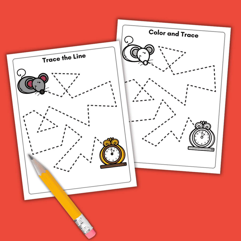 The first page in this set of nursery rhymes activities instructs children to color the pictures (a mouse and a clock) and to trace the line from top to bottom and left to right.