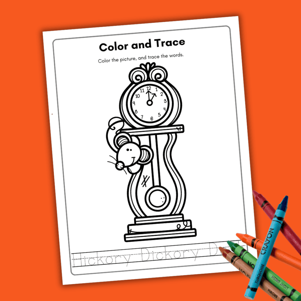 Finally, children will color a picture of the mouse running down the clock. Then, they will trace the title of the nursery rhyme, Hickory Dickory Dock.