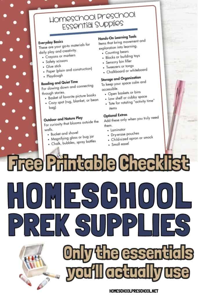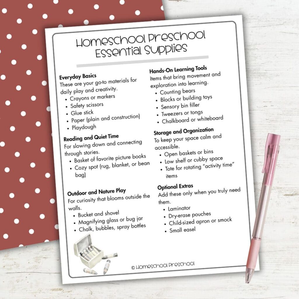 If you’ve been wondering how to start homeschooling preschool, this list keeps it simple. Think crayons over curriculum, baskets over bins, and moments over materials. You don’t need fancy setups or expensive kits to give your child a gentle start.