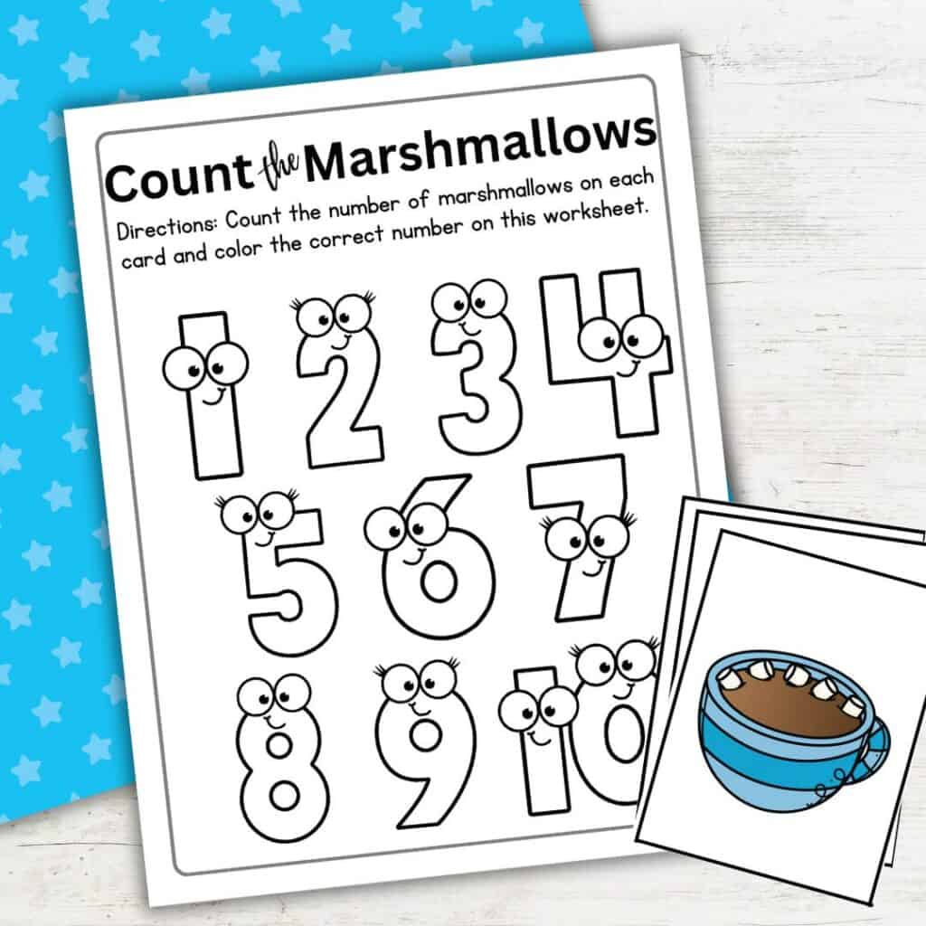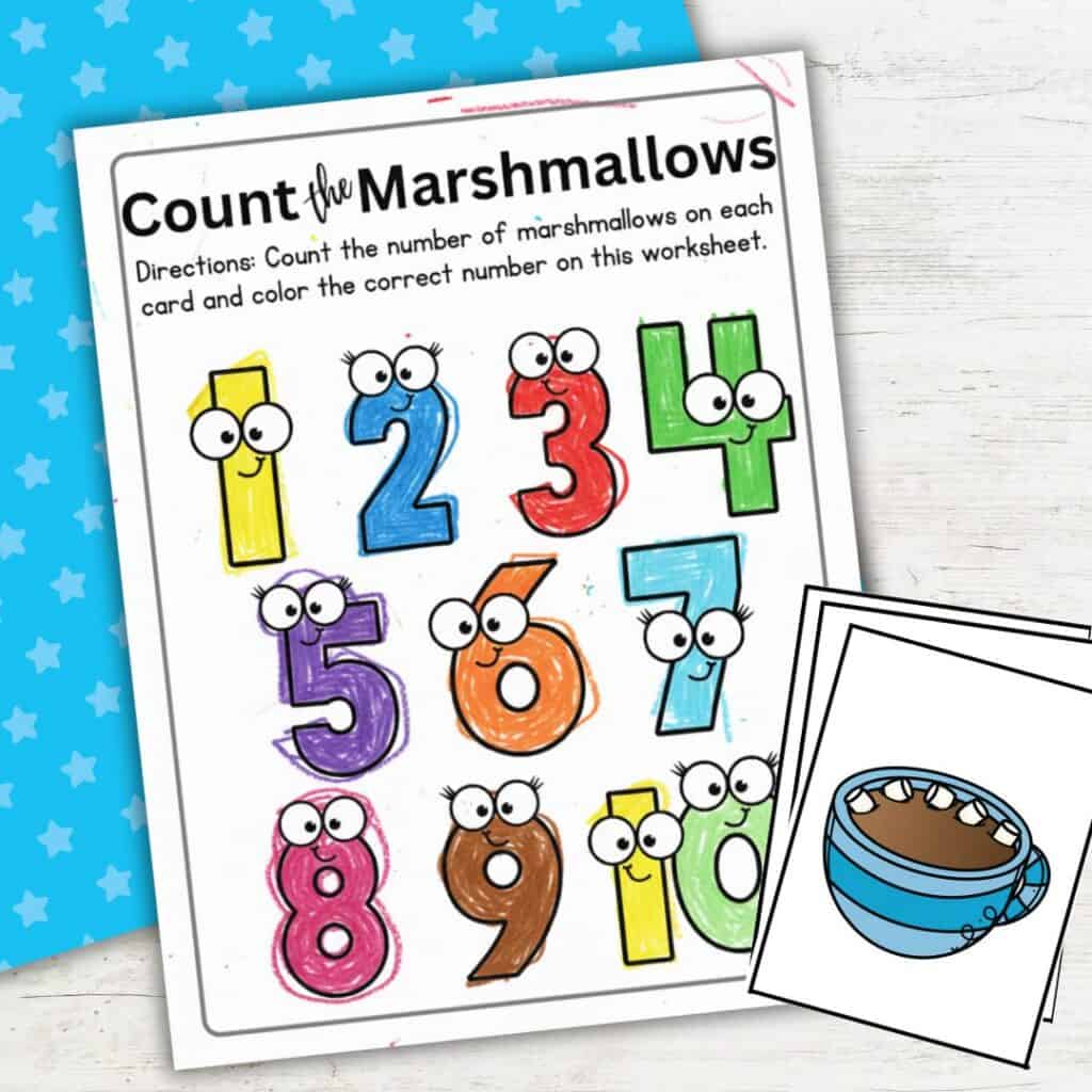 Hot Chocolate Count and Color preschool math printable with marshmallow counting cards, number coloring page, and crayons on a white table.