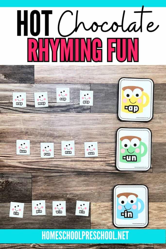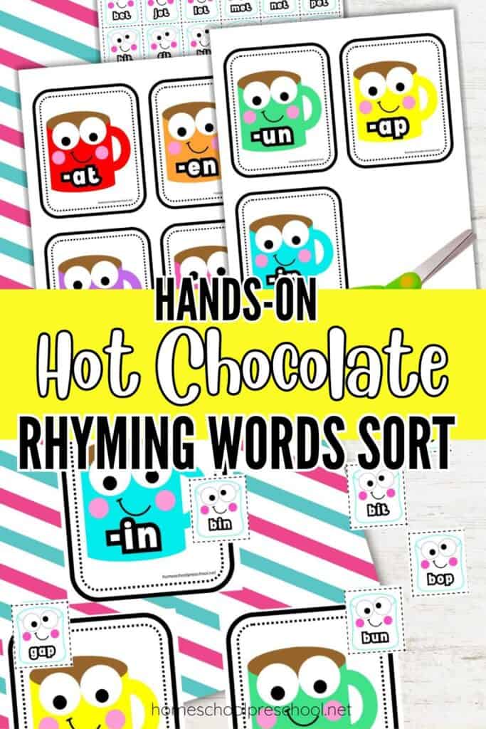 These rhyme activities for preschool make practicing rhyming fun and simple. With engaging word families and colorful hot chocolate visuals, kids can easily identify and match rhyming words while building a strong foundation for early reading. The playful theme encourages kids to listen for sound patterns and explore how words are connected, all while having a great time.