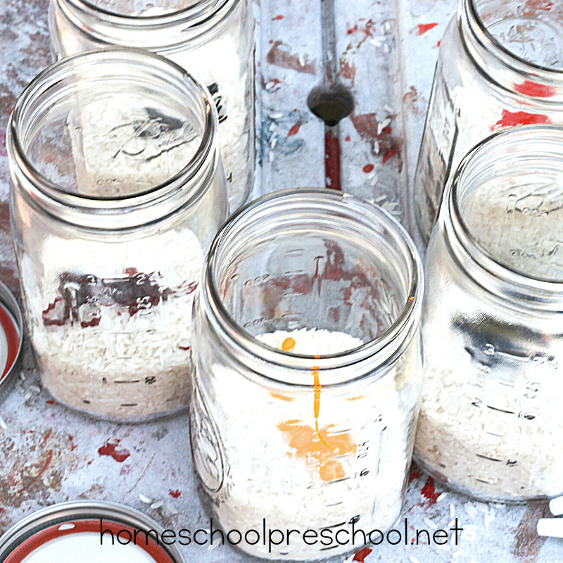 To start, pour white rice into your mason jars. We split ours between 5 different jars, one for each color.