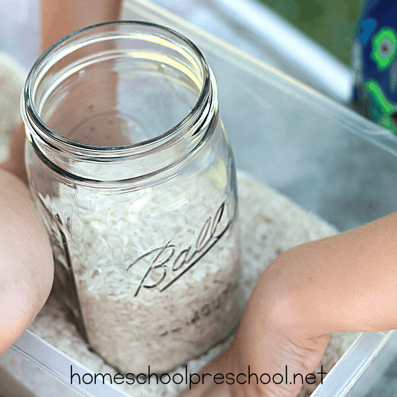 Kids can use kitchen tools to scoop, pour, and measure the rice.