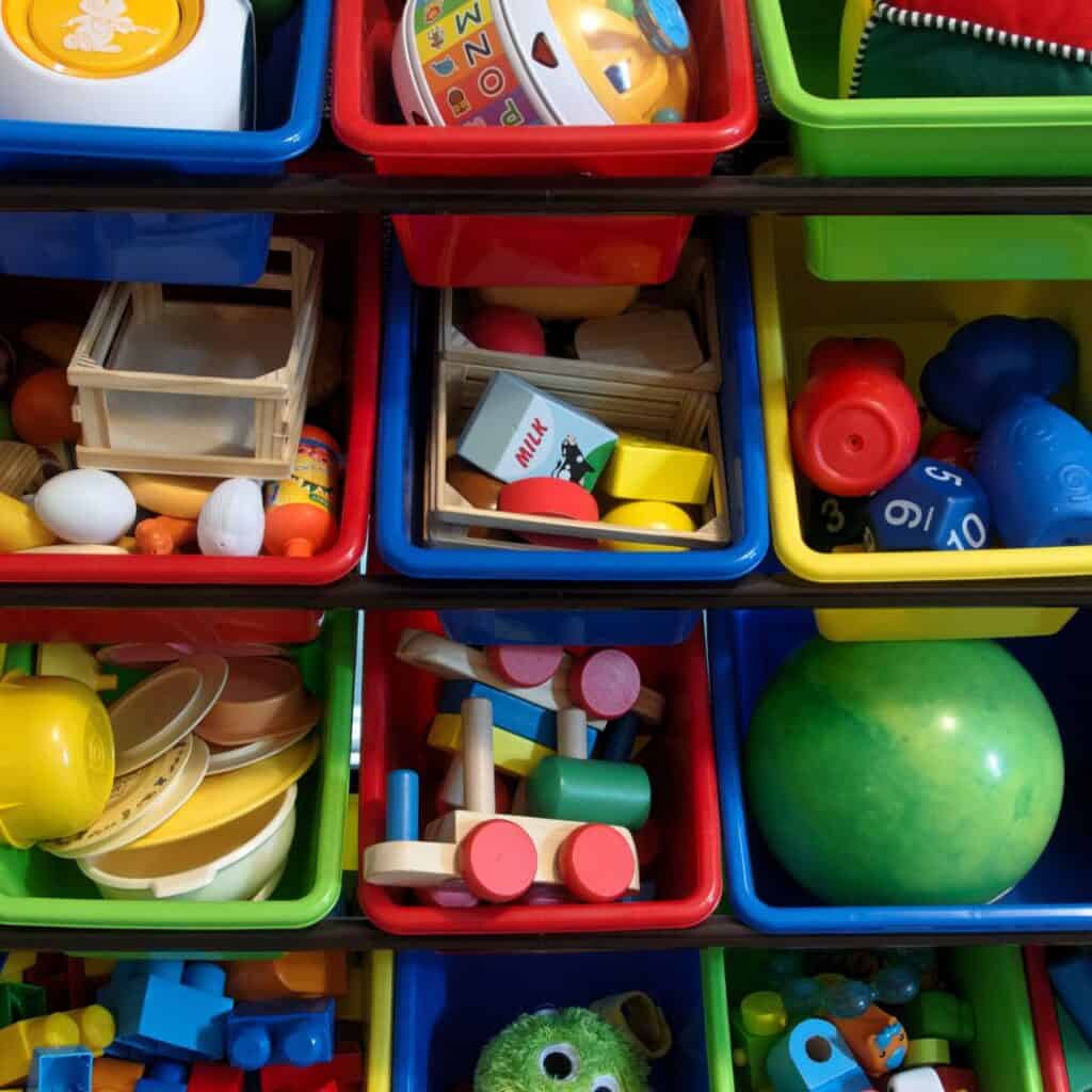 Use low shelves, baskets, or plastic bins your preschooler can open and carry on their own. Clear bins work wonderfully, and adding picture labels can make it even easier for little ones to know where things go.