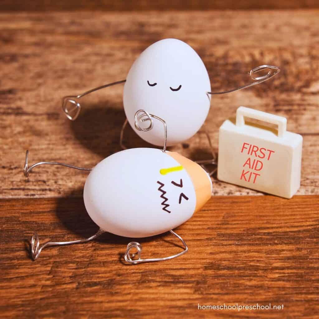 Cut an egg shape out of paper and then cut it into pieces like a puzzle. Have kids work together to put “Humpty Dumpty” back together again. This encourages teamwork and develops problem-solving skills.