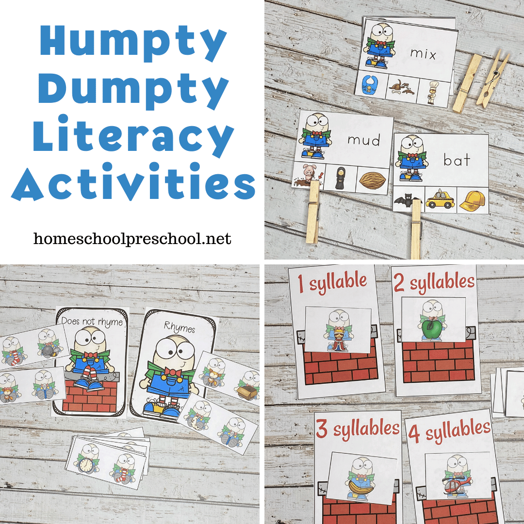 These Humpty Dumpty literacy activities are a great way to add rhymes, syllables, and CVC words to your nursery rhyme unit.