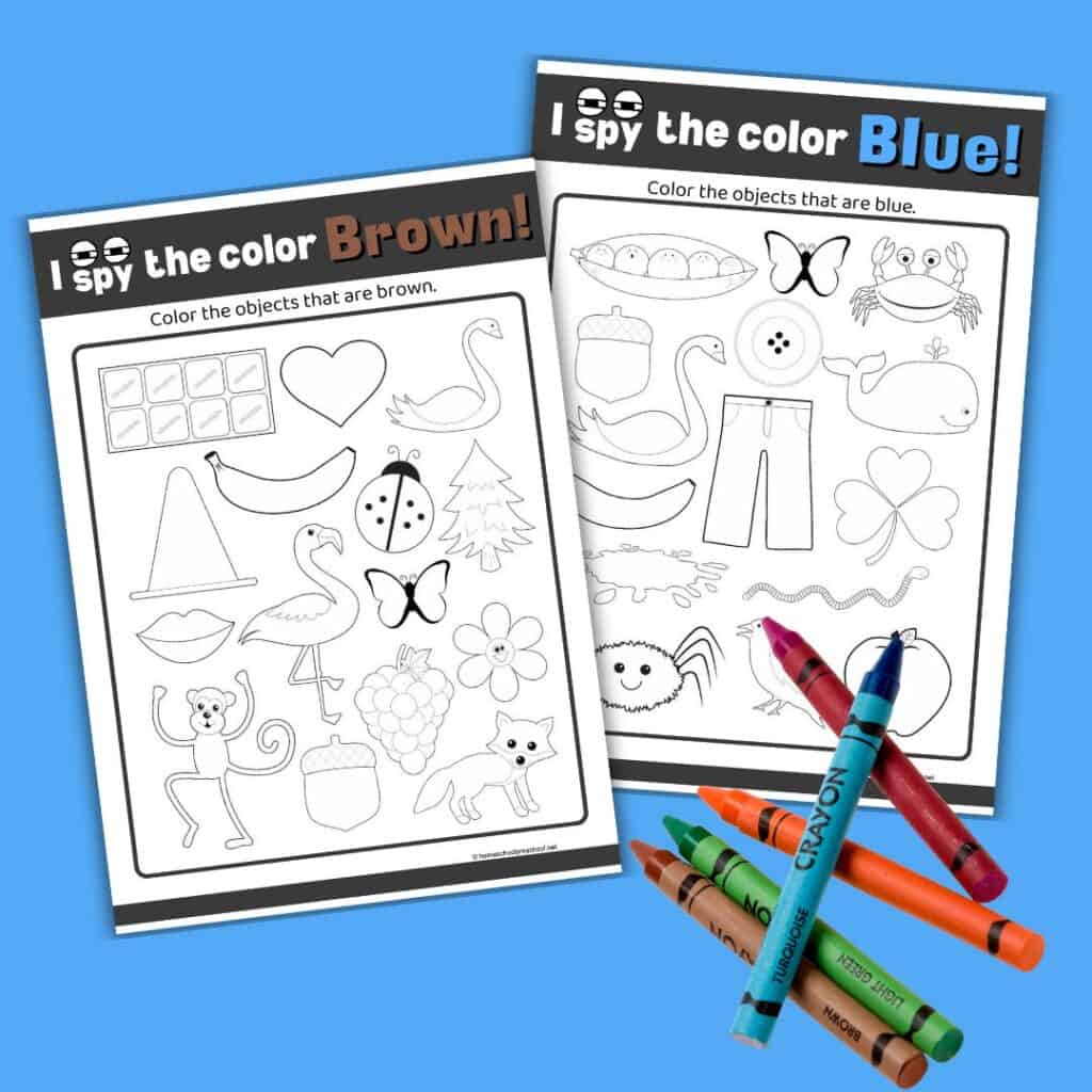 Each I Spy Colors worksheet starts with a color word at the top of the page. This is your child’s clue! Their mission is to become a color detective and find all the objects on the page that match that specific color. Once they’ve spotted an object, it’s time to grab their favorite crayons and color it in!
