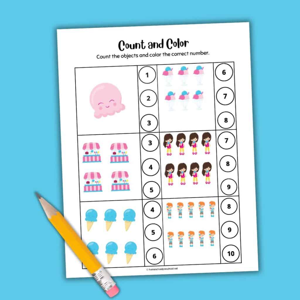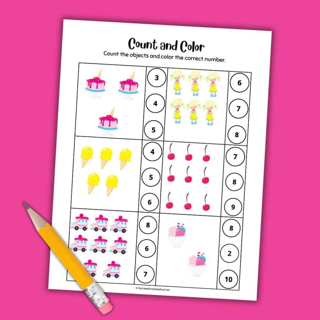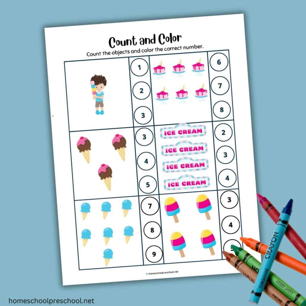 Here’s how to enjoy these ice cream counting worksheets with your little learner:
