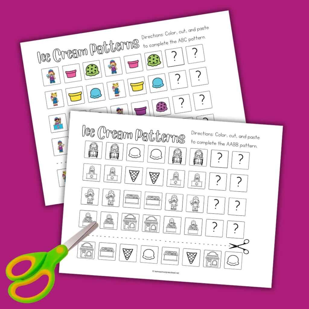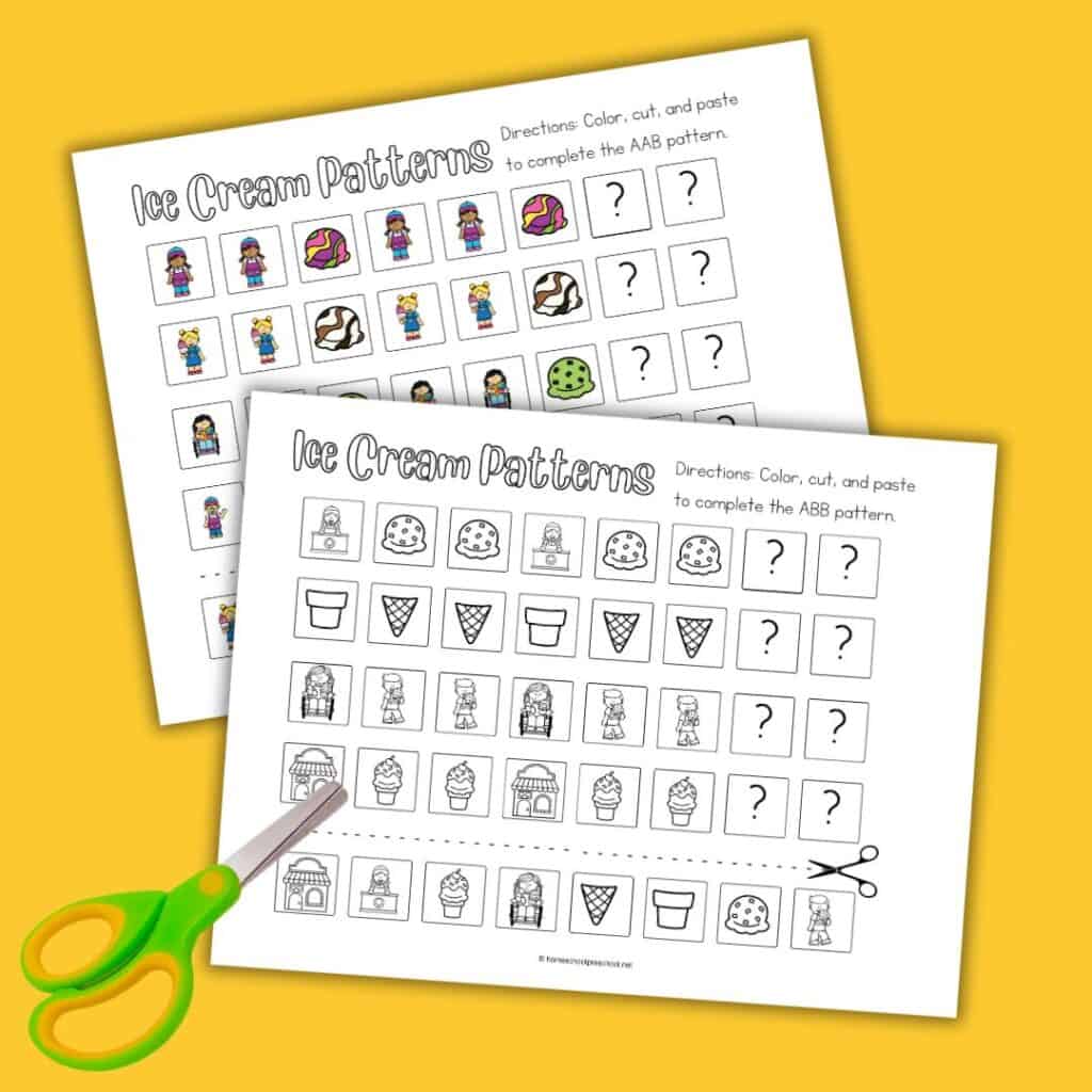 We have a collection of ice cream pattern activity pages that you can easily download and use. These worksheets come in various difficulty levels to cater to different learning stages. There’s something for every preschooler from simple AB patterns to more complex ABC and AABB patterns.