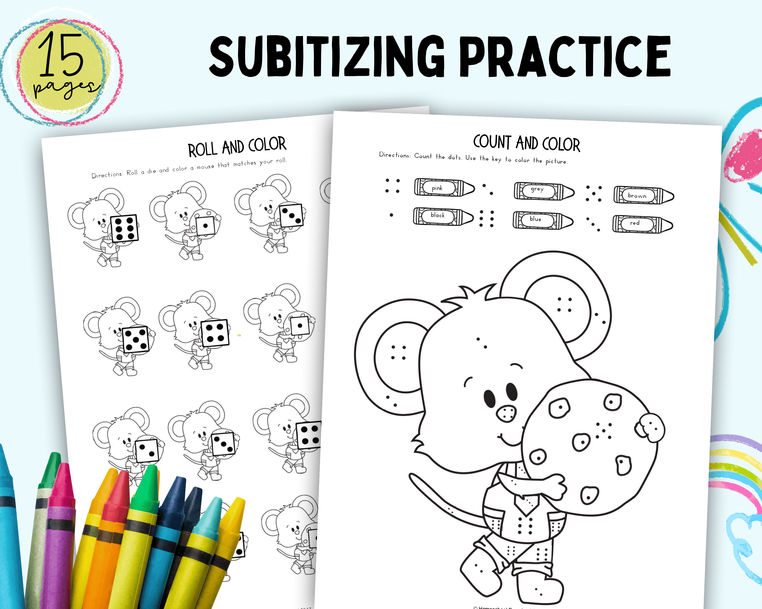 On one page, they’ll roll one dice and color the mouse holding the same number. On the other, they’ll use the color code to color a picture of Mouse and his cookie.