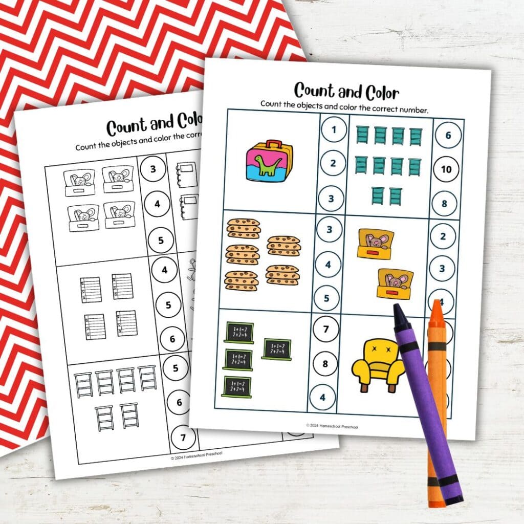 These preschool counting worksheets pick up right where the book leaves off, giving our kids a chance to count lunchboxes, crayons, and classroom chaos—just like in the story.