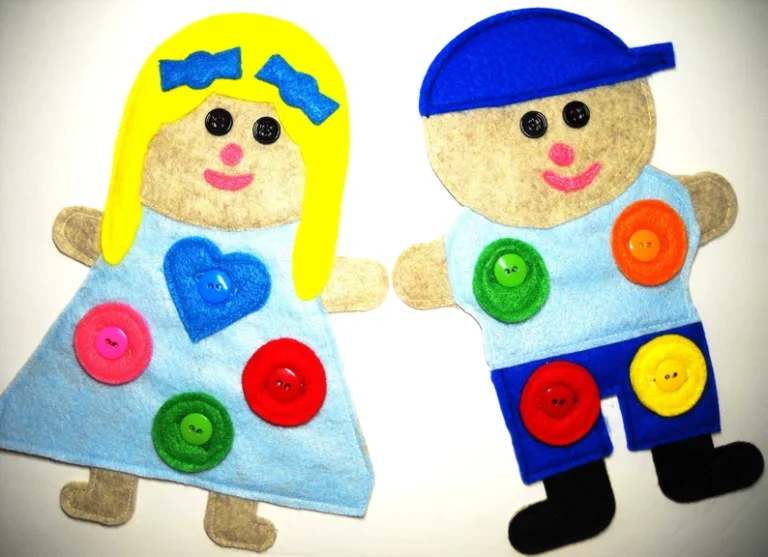 This is a felt toy shaped like characters named Jack and Jill, designed to help young children learn colors, shapes, and how to button clothes.