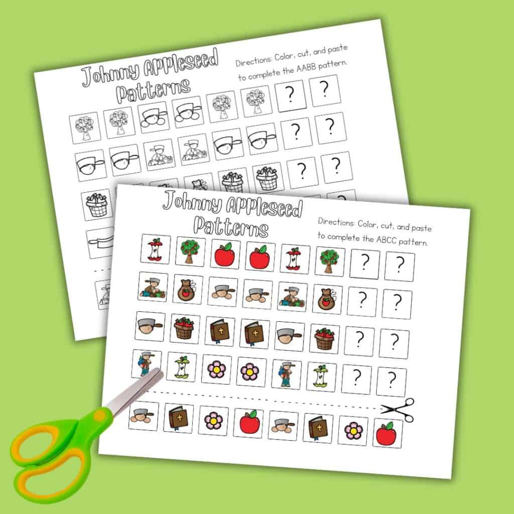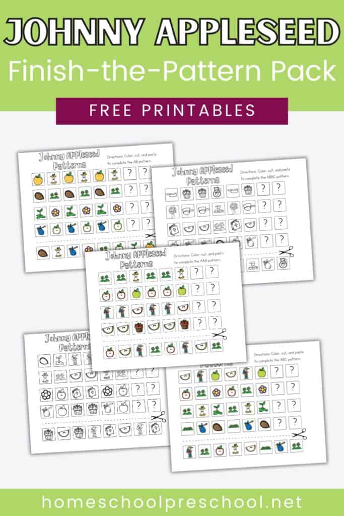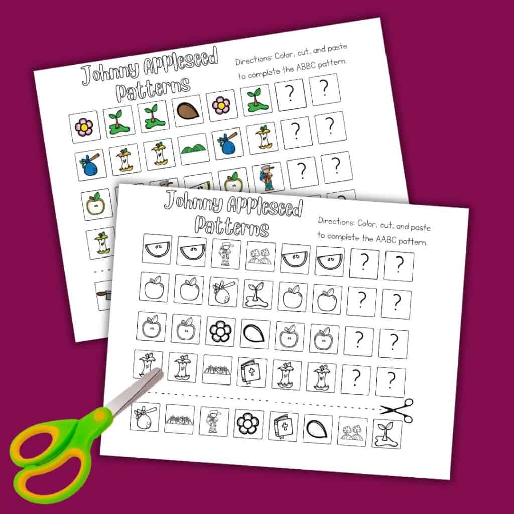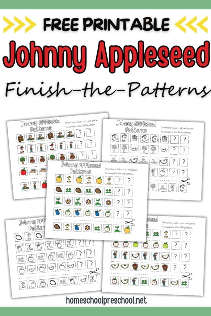 We have some fantastic free preschool printables to make learning about patterns exciting. These Johnny Appleseed-themed worksheets feature the following patterns: