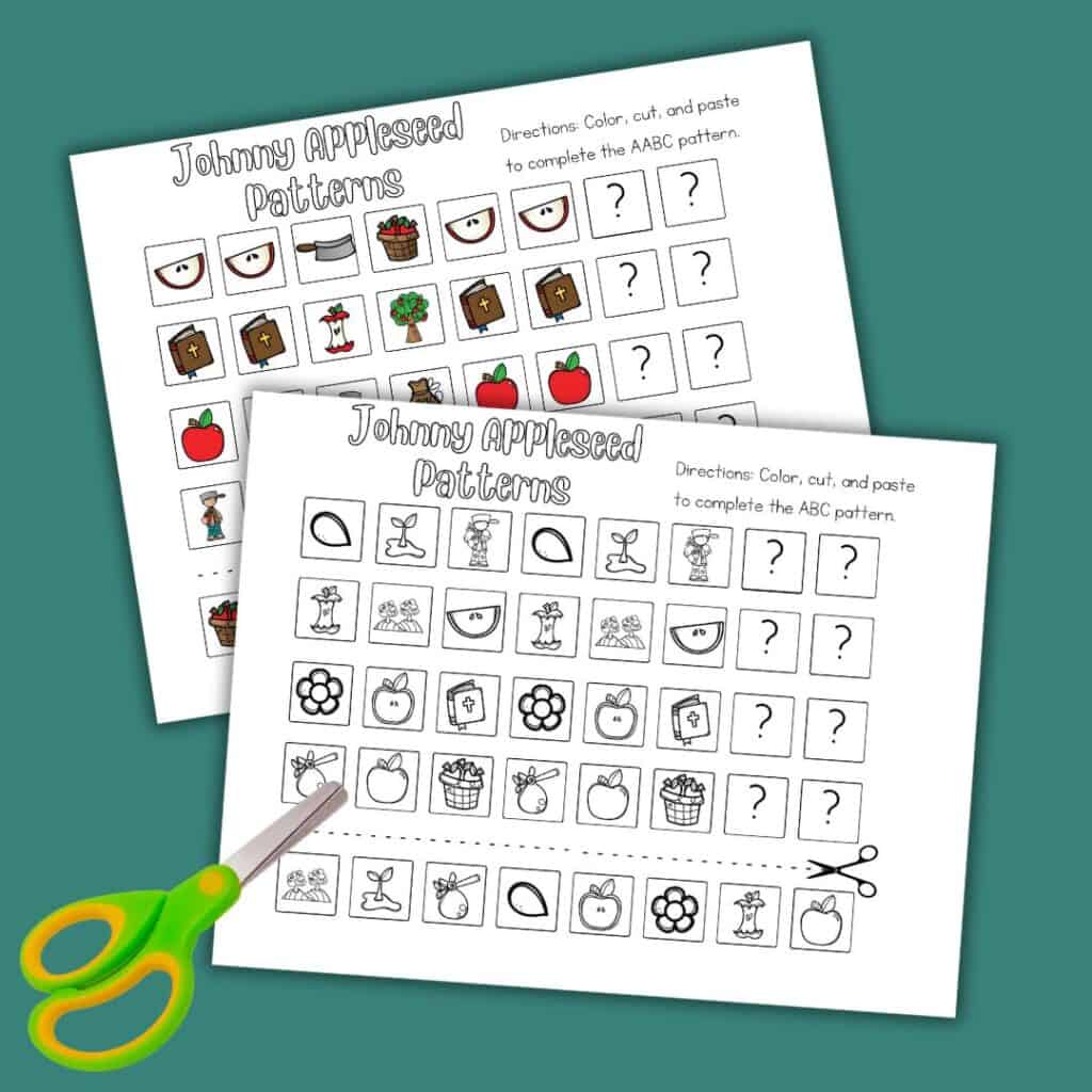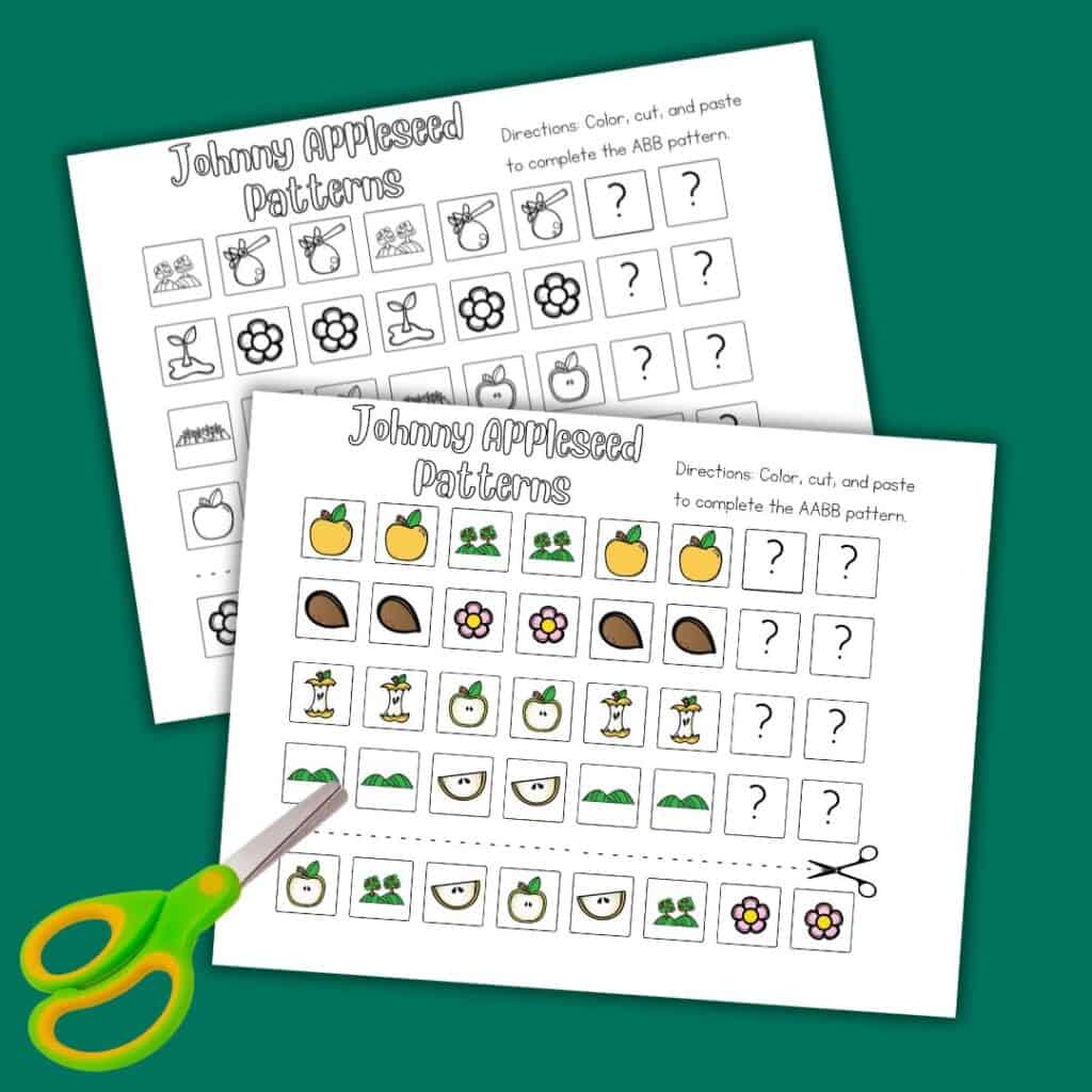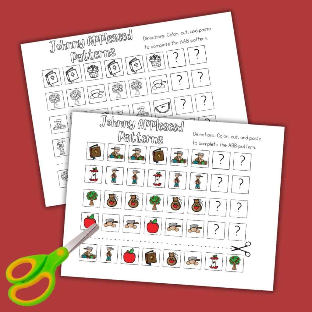 We have some fantastic free preschool printables to make learning about patterns exciting. These Johnny Appleseed-themed worksheets feature the following patterns: