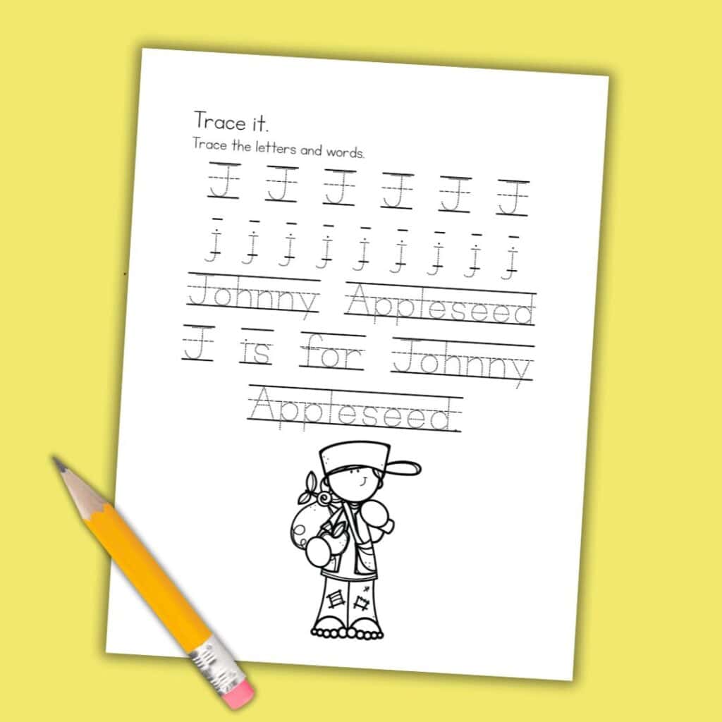 Next, try literacy activities like tracing the letters in “Johnny Appleseed” to boost letter recognition and early writing abilities. To round things out, include fine motor tasks like cutting out apple shapes or threading beads to look like seeds.
