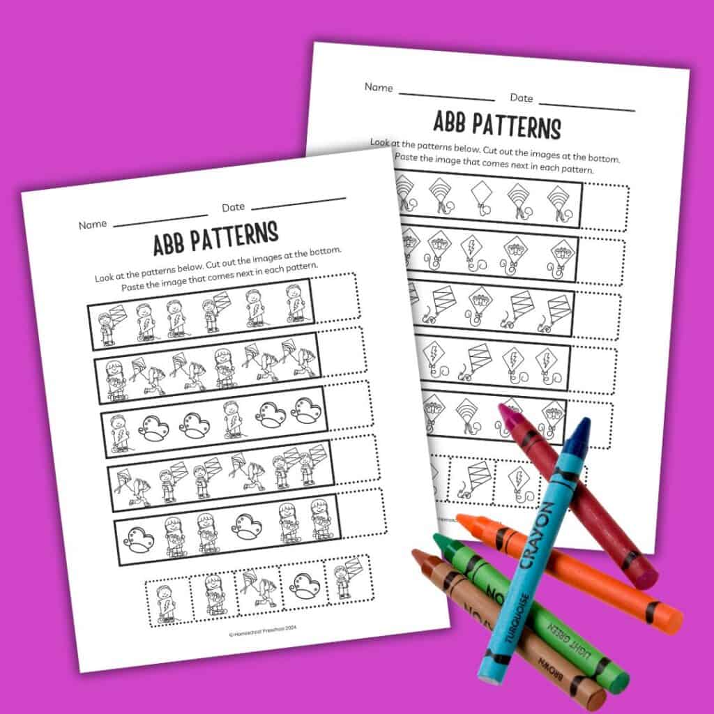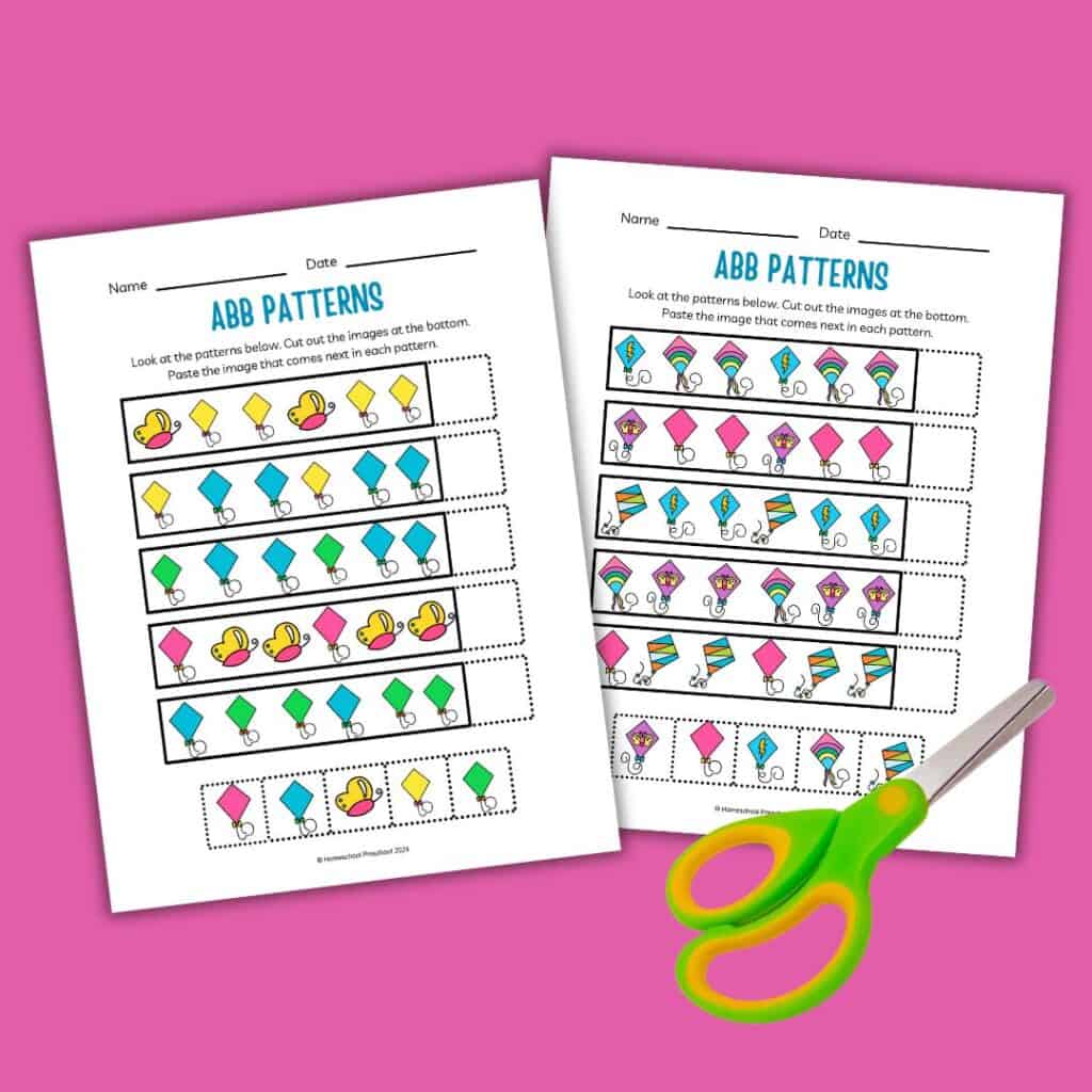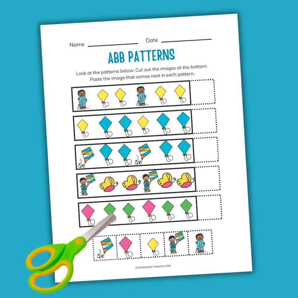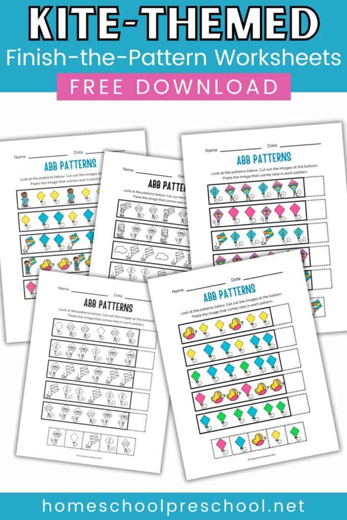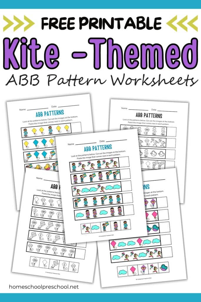 We offer a variety of free preschool printables to help children practice ABB patterns. These printables feature kite designs, encouraging kids to identify and continue the pattern. Each worksheet is designed to be easy to understand, making it simple for preschoolers to complete with minimal assistance.