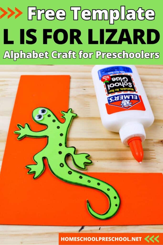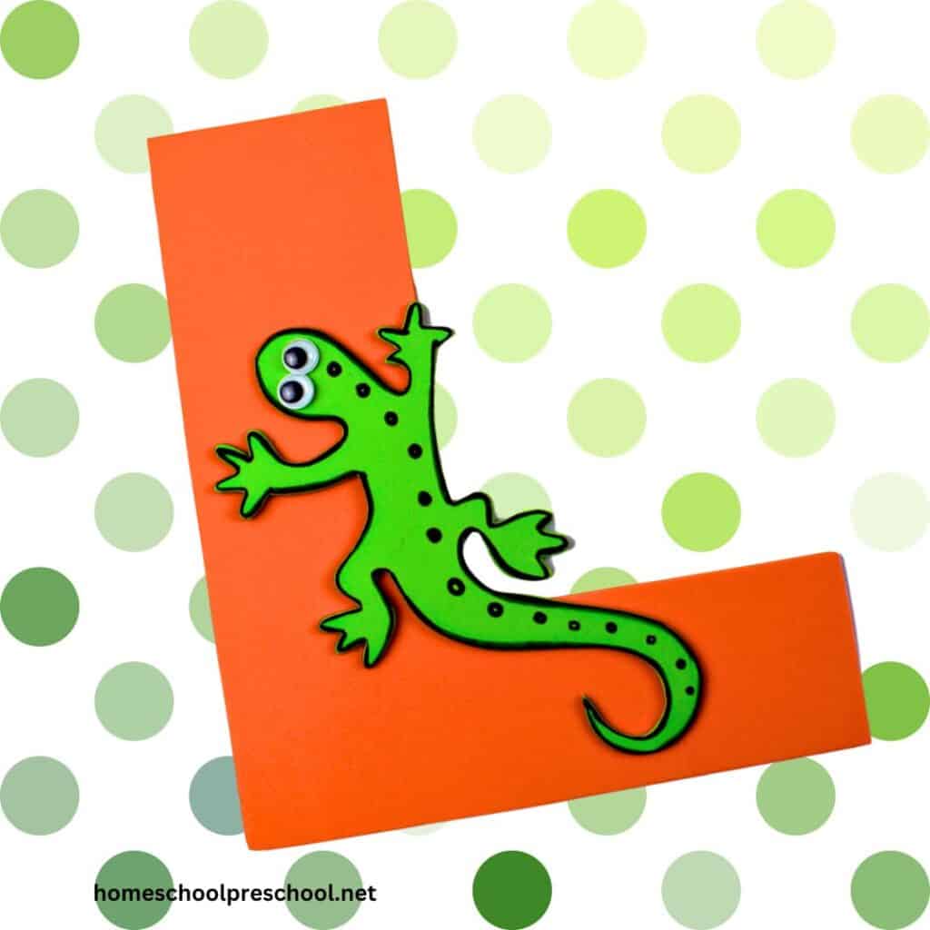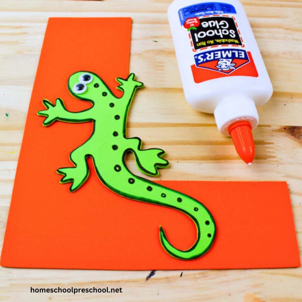 Lastly, apply some glue to the back of your lizard and carefully stick it onto your letter L. Voila! You’ve just made an awesome L is for Lizard craft!