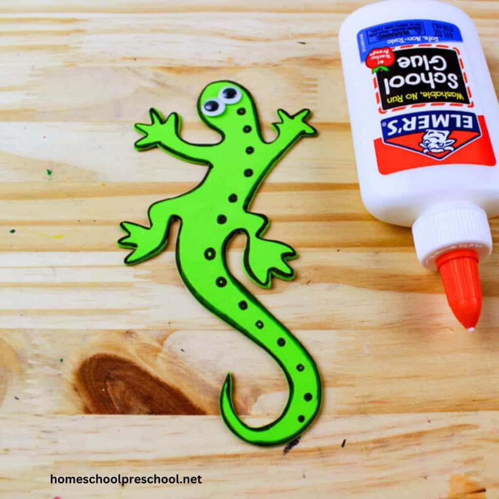 Now for the fun part – googly eyes! If you’re using them, pop those onto your lizard with a little glue.