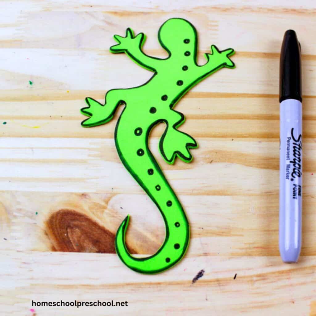 We can add some personality to our lizard with a black marker. Feel free to get creative and draw on some details like scales or a cute little smile.