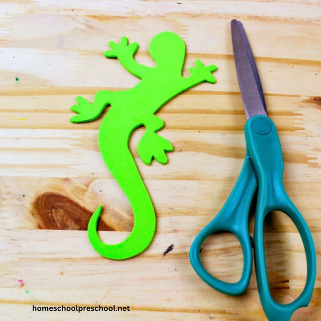 Next up, we’ll make our lizard friend! Print the lizard template on cardstock. Cut it out and trace it onto a colored craft foam sheet. Now, cut out your lizard shape.