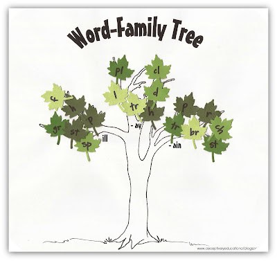 Punching leaves with a paper punch really works fine motor muscles. When you add a few letters to those leaves, your preschool can make some word family trees. Deceptively Educational