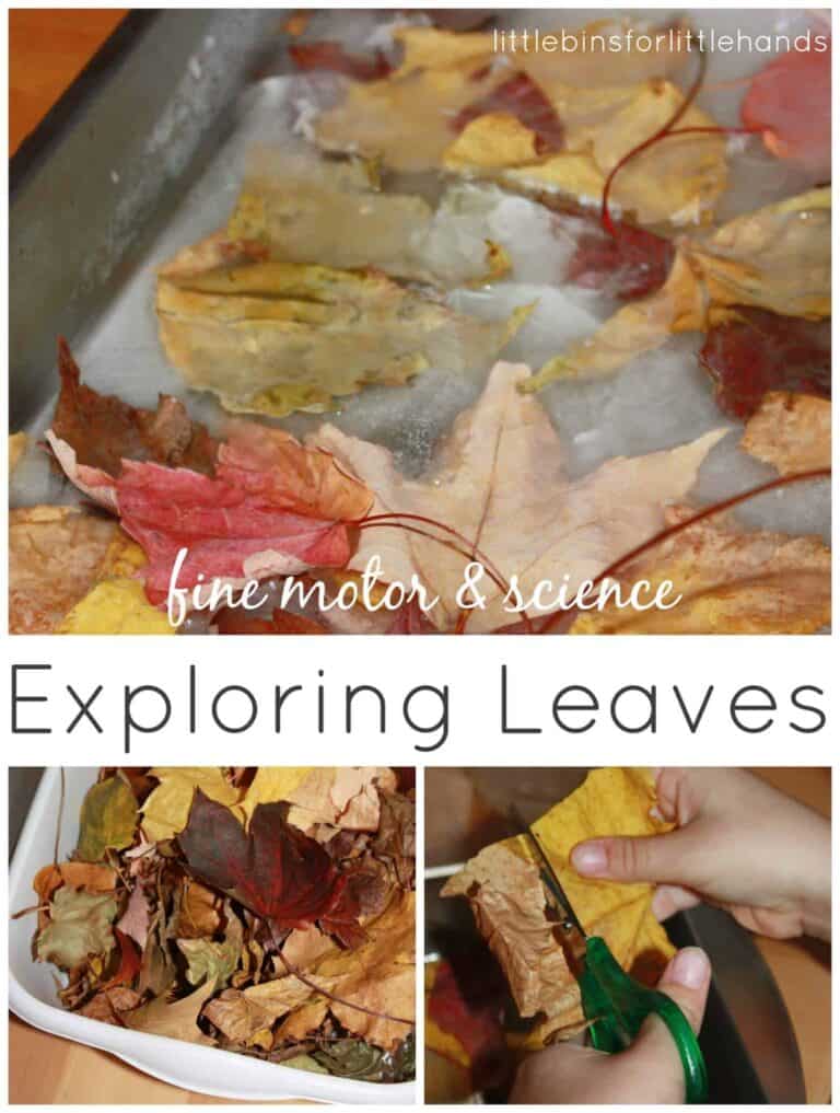 When you set up a leaf sensory tray, kids can explore leaves with many different fine motor activities. Use a dropper to drip water. Use scissors to cut them. Use tweezers to pick them up. The possibilities are endless! Little Bins for Little Hands