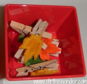 Kids will build fine motor skills as they pinch clothespins to decorate this fall tree with leaf clothespins. It’s simple enough for toddlers to do! Stir the Wonder