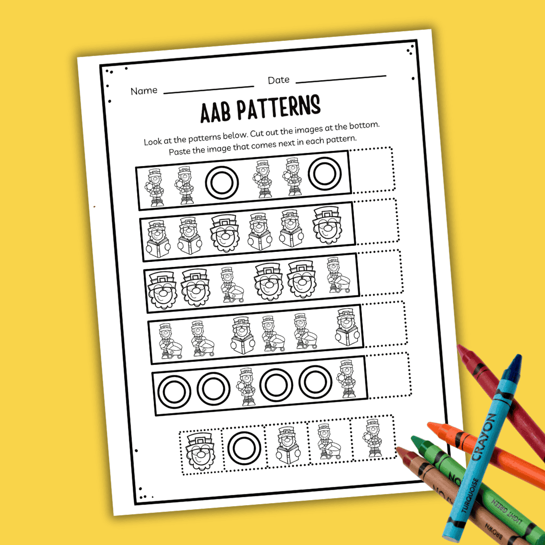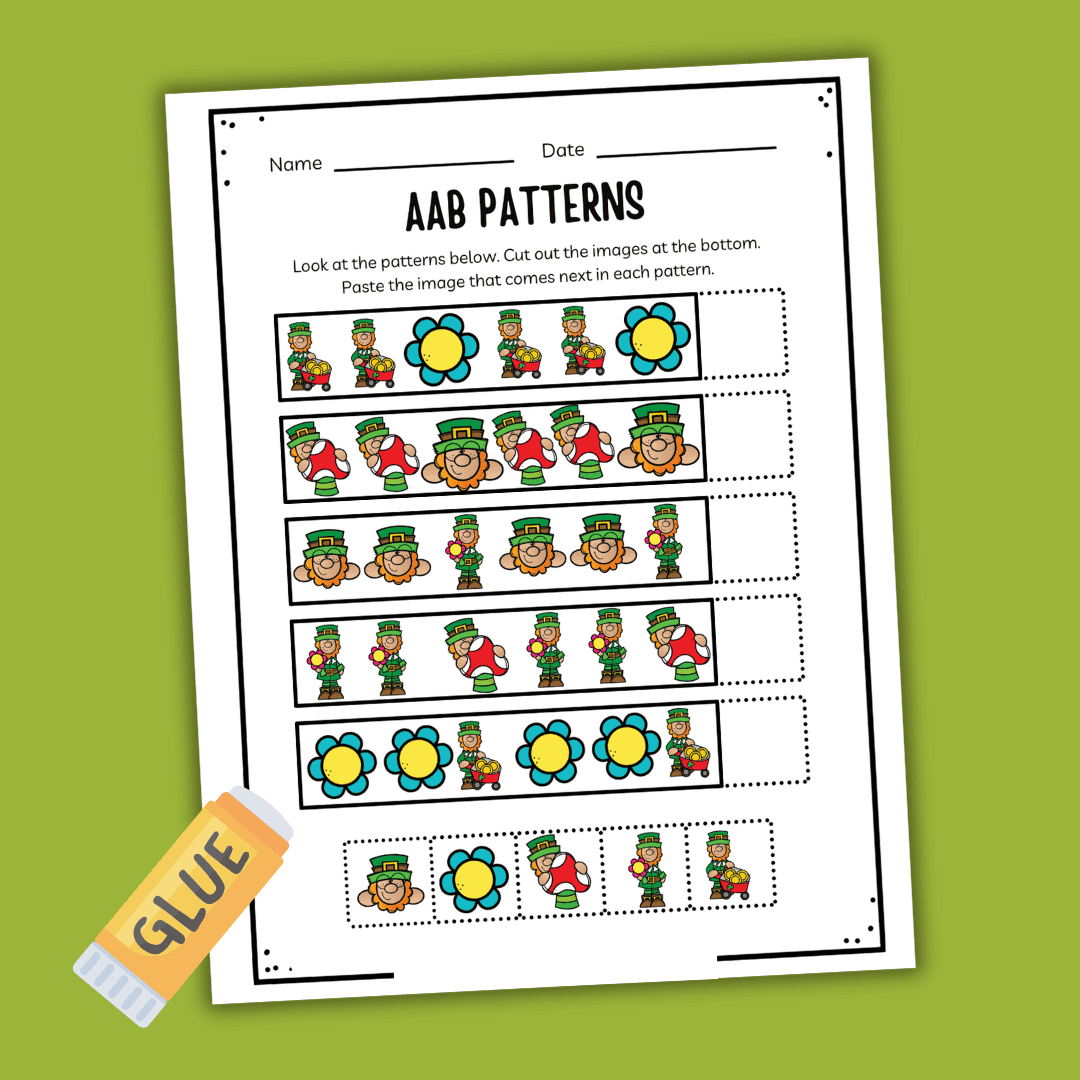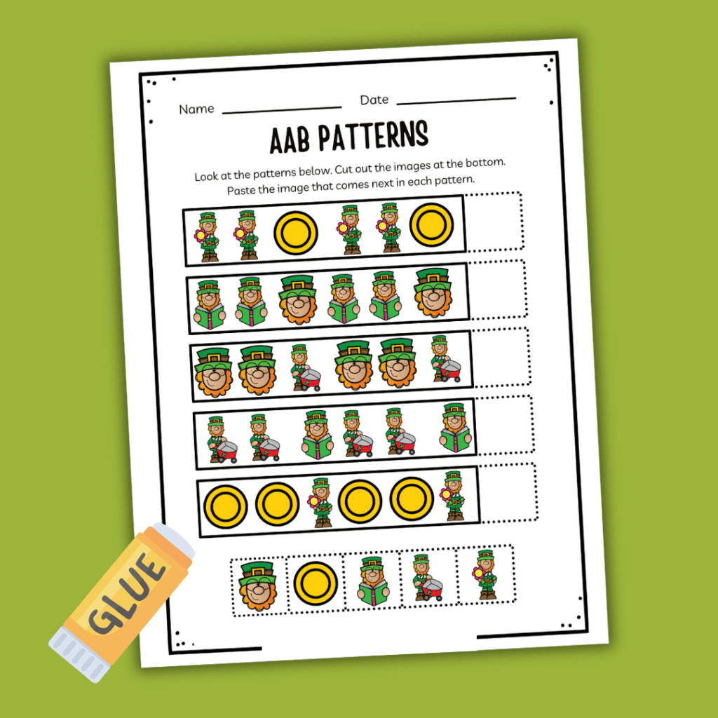 Filled with charming leprechaun graphics, these worksheets will keep your child entertained as they color, cut, and paste their way to understanding basic patterning. Whether your child is just starting to recognize patterns or is ready for a slight challenge, we have worksheets that cater to different skill levels.