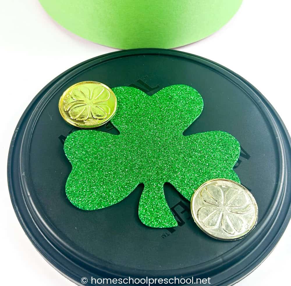 - Glue or tape a shamrock and gold coins to the lid of the container. Use strong tape to attach the lid to the container.