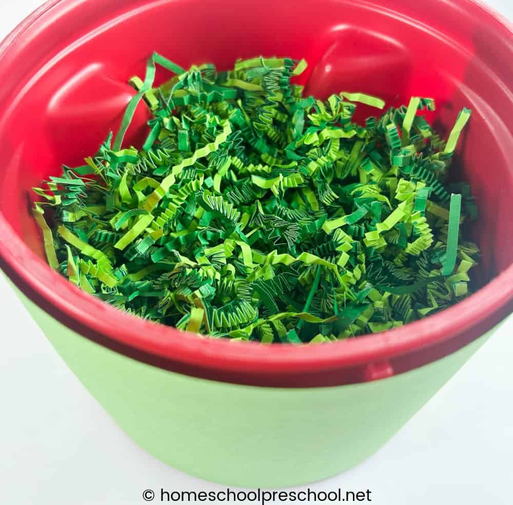 - Fill the container with paper shred about ¾ full.