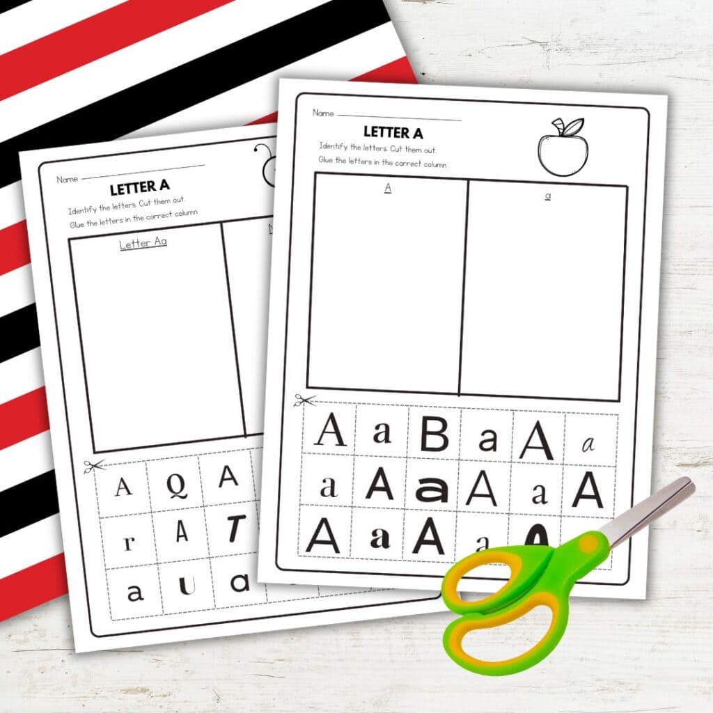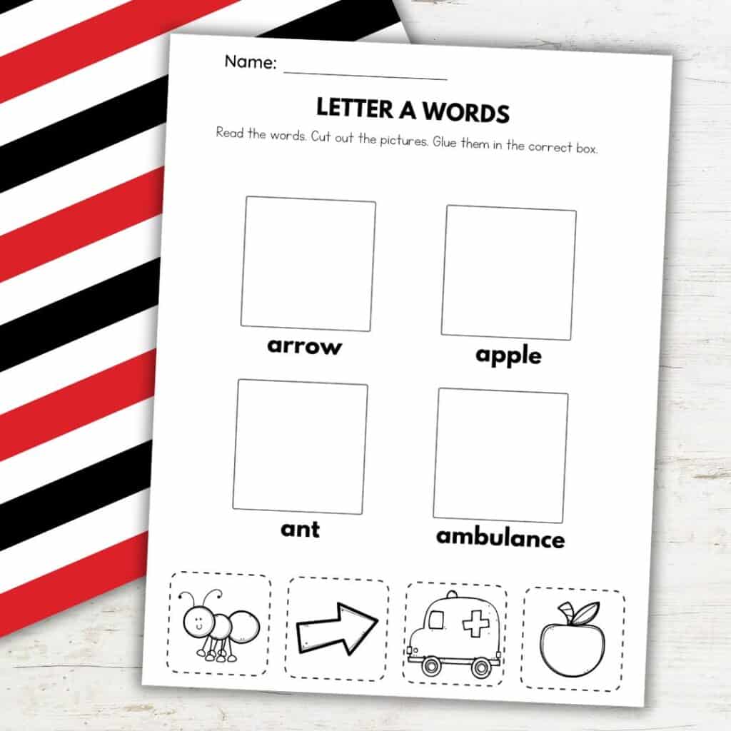 This printable pack is a hands-on, interactive way to help preschoolers explore and understand the letter A. With a focus on letter recognition, beginning sounds, and early reading skills, these worksheets give kids the chance to cut, sort, match, and label—all while having fun with scissors and glue!