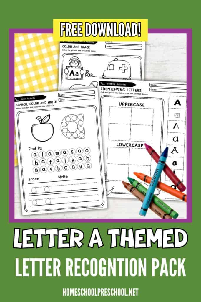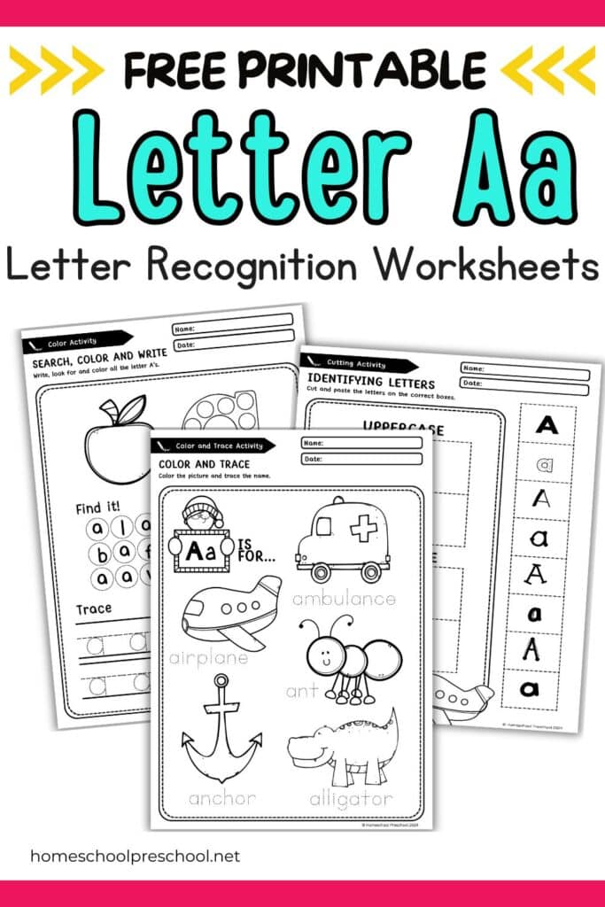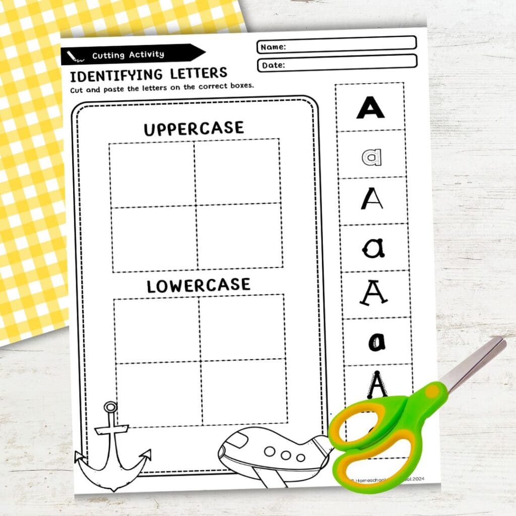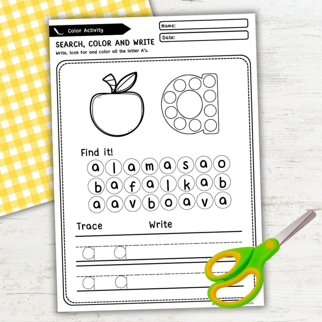 Kids can learn essential early literacy skills from this activity, including recognizing and identifying the letter A. They’ll practice distinguishing between uppercase and lowercase A while building fine motor skills through tracing, coloring, and cutting.
