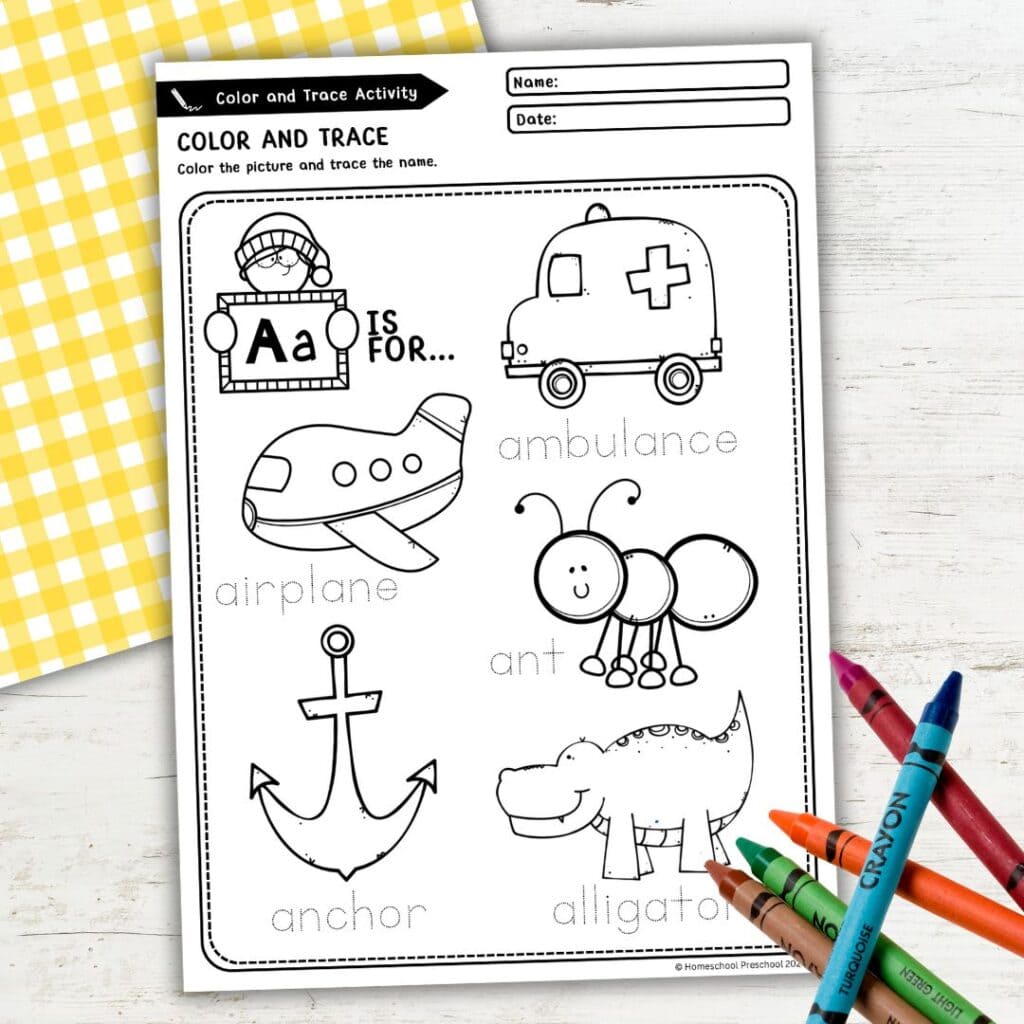 - Color and Trace Activities: Explore letter sounds by coloring objects like ants and airplanes while tracing their names.