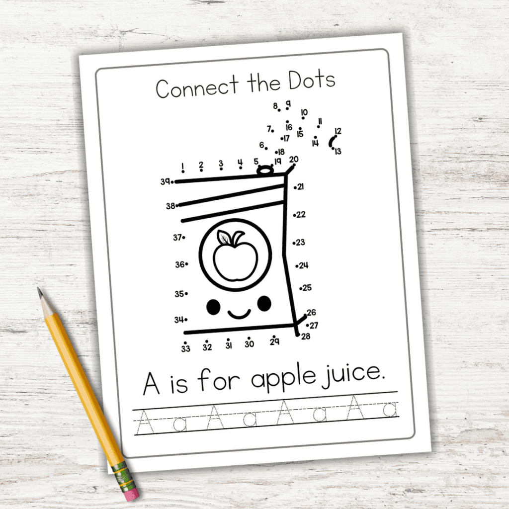 Preschoolers will love connecting the dots from 1 to 39 to reveal a box of apple juice. When they’re done, they can color it and then trace the letters at the bottom of the page.