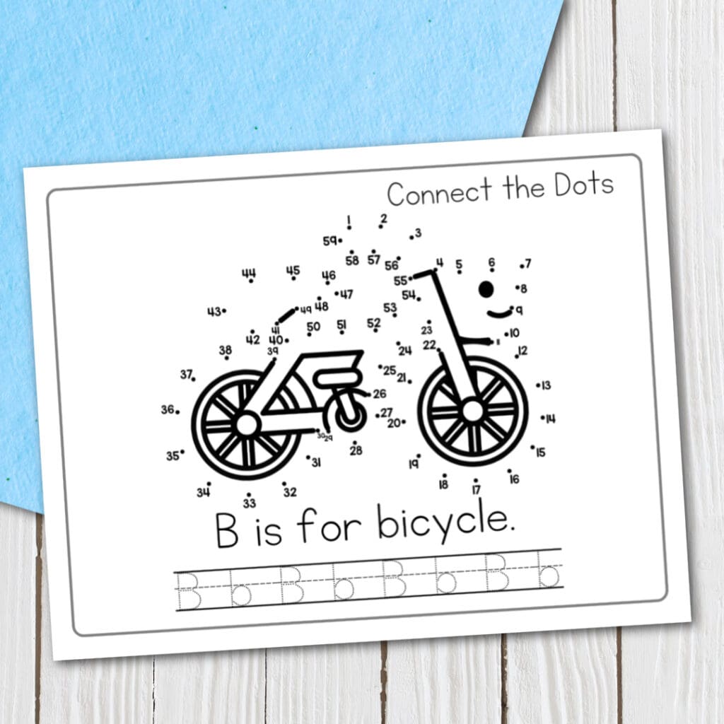 Preschoolers will love connecting the dots from 1 to 59 to reveal a bicycle. When they’re done, they can color it and then trace the letters at the bottom of the page.